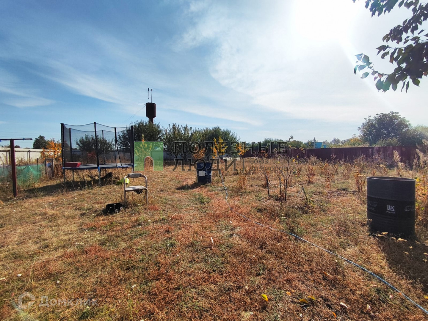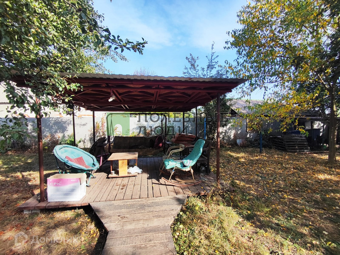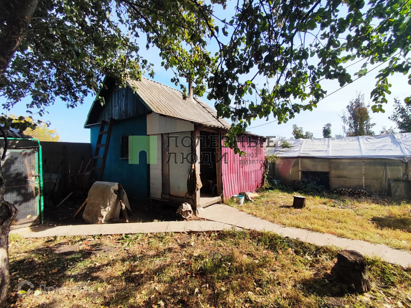 На территории есть летний домик, состоящий из 2х комнат, с печкой-буржуйкой; баня; беседка; теплица; сарай для хранения садового инвентаря и холодным погребом; навес под автомобиль (есть ворота, через которые можно заехать на участок).