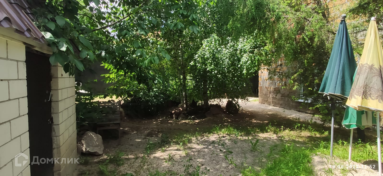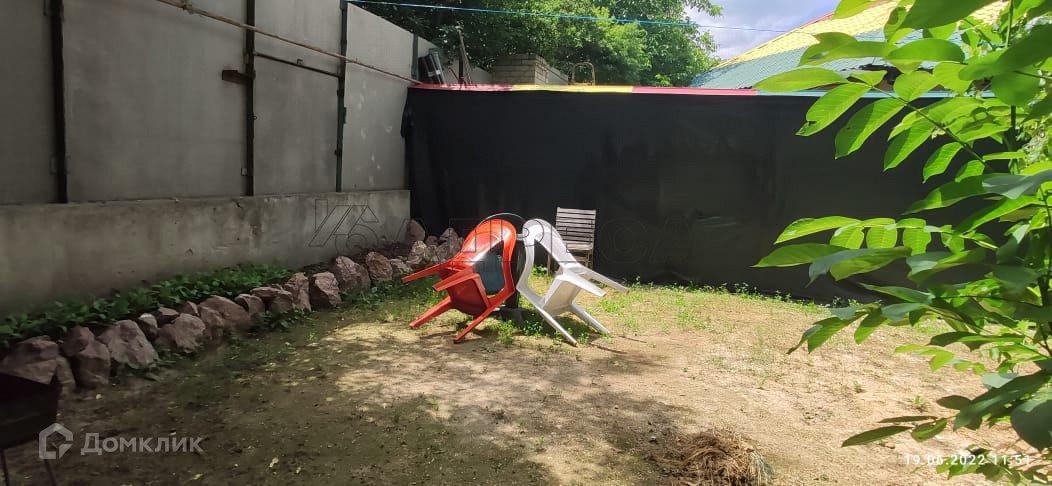 Во дворе домик для собаки. По периметру забор с откатными воротами. На участке растут деревья.