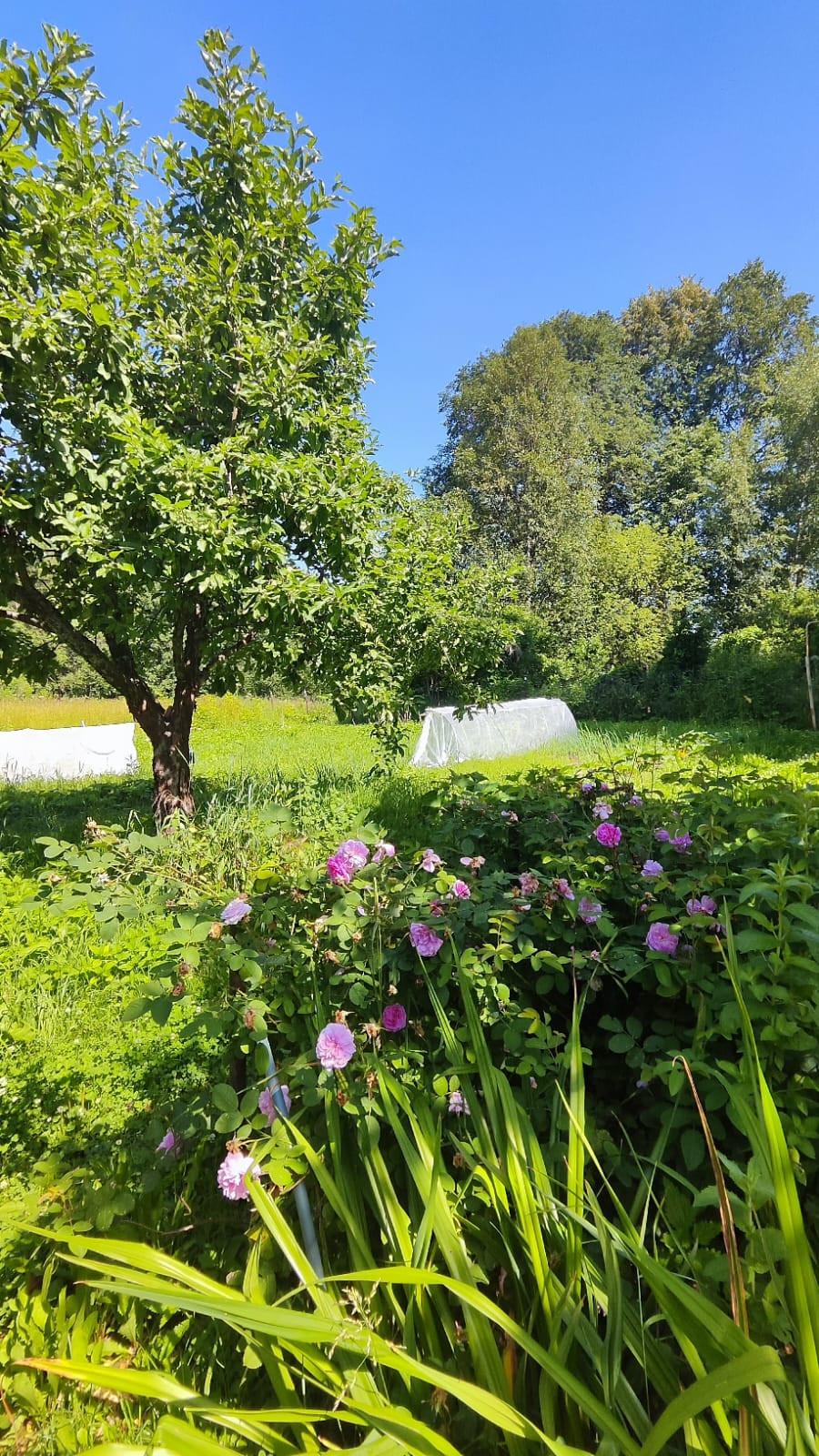 На участке имеются, ухоженный газон и различные цветы.