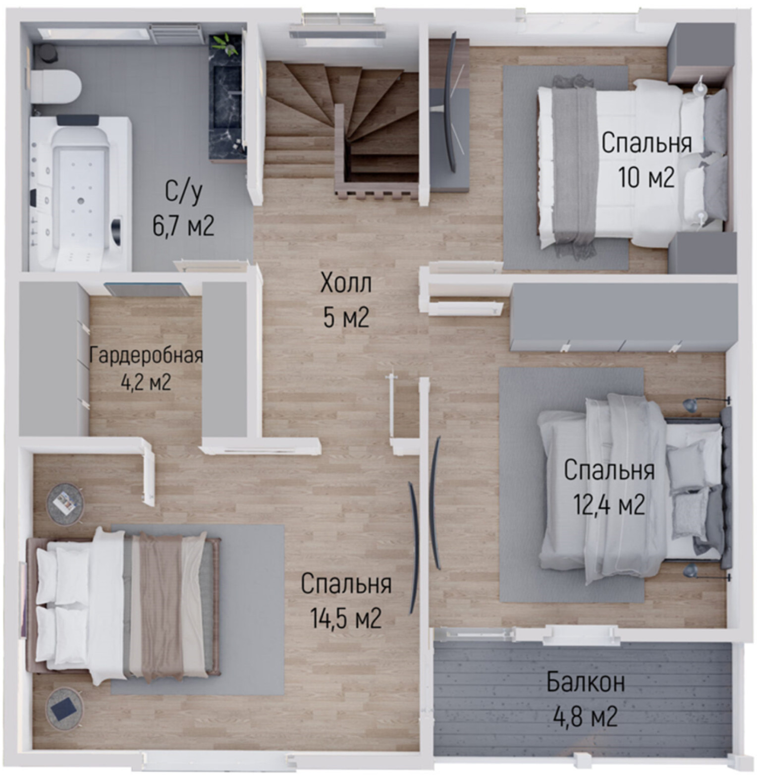 Продуманная планировка включает: 4 функциональные спальни, уютная кухня-гостиная и просторный холл , 2 санузла, тех.помещение и гардеробная.