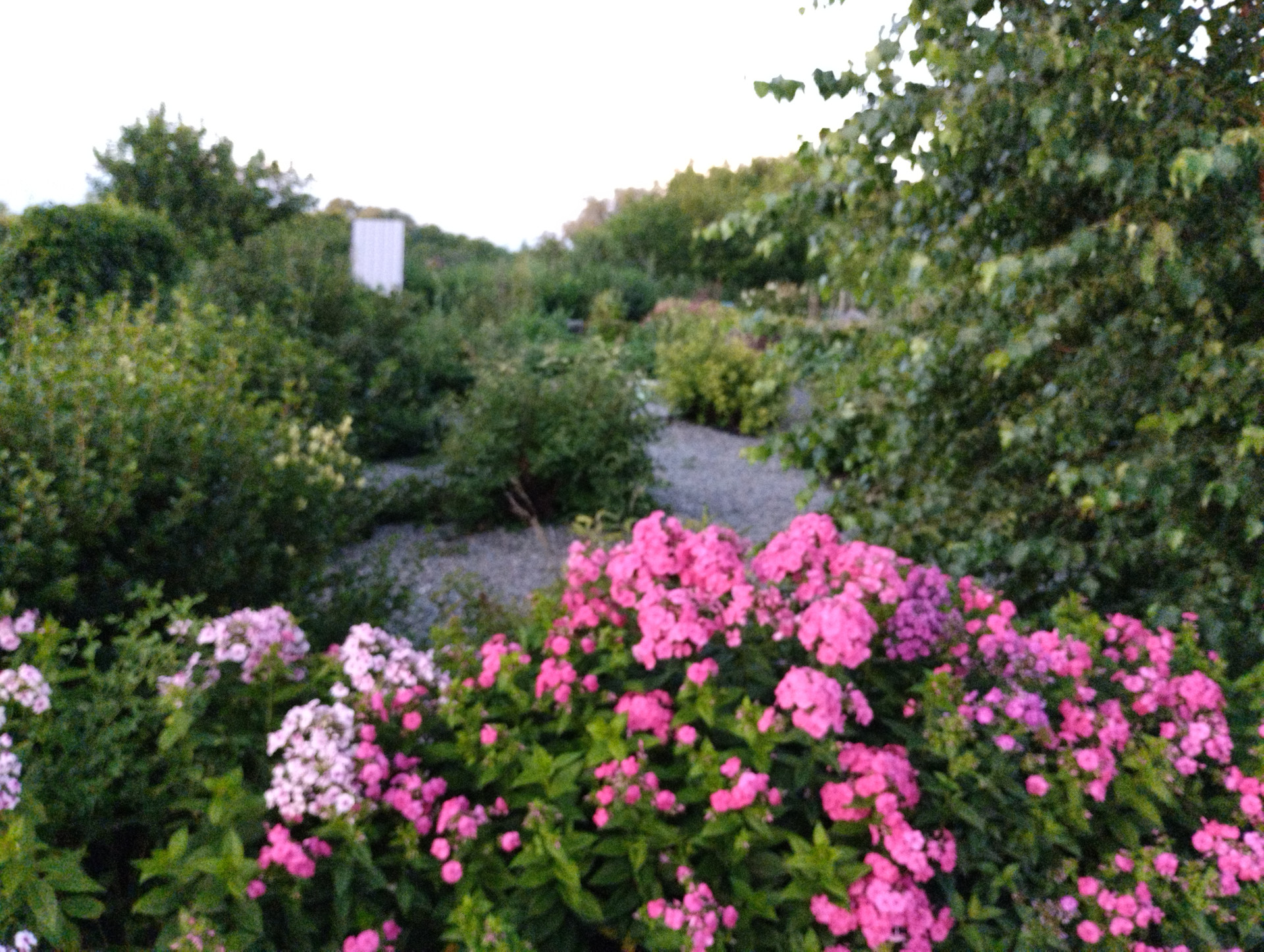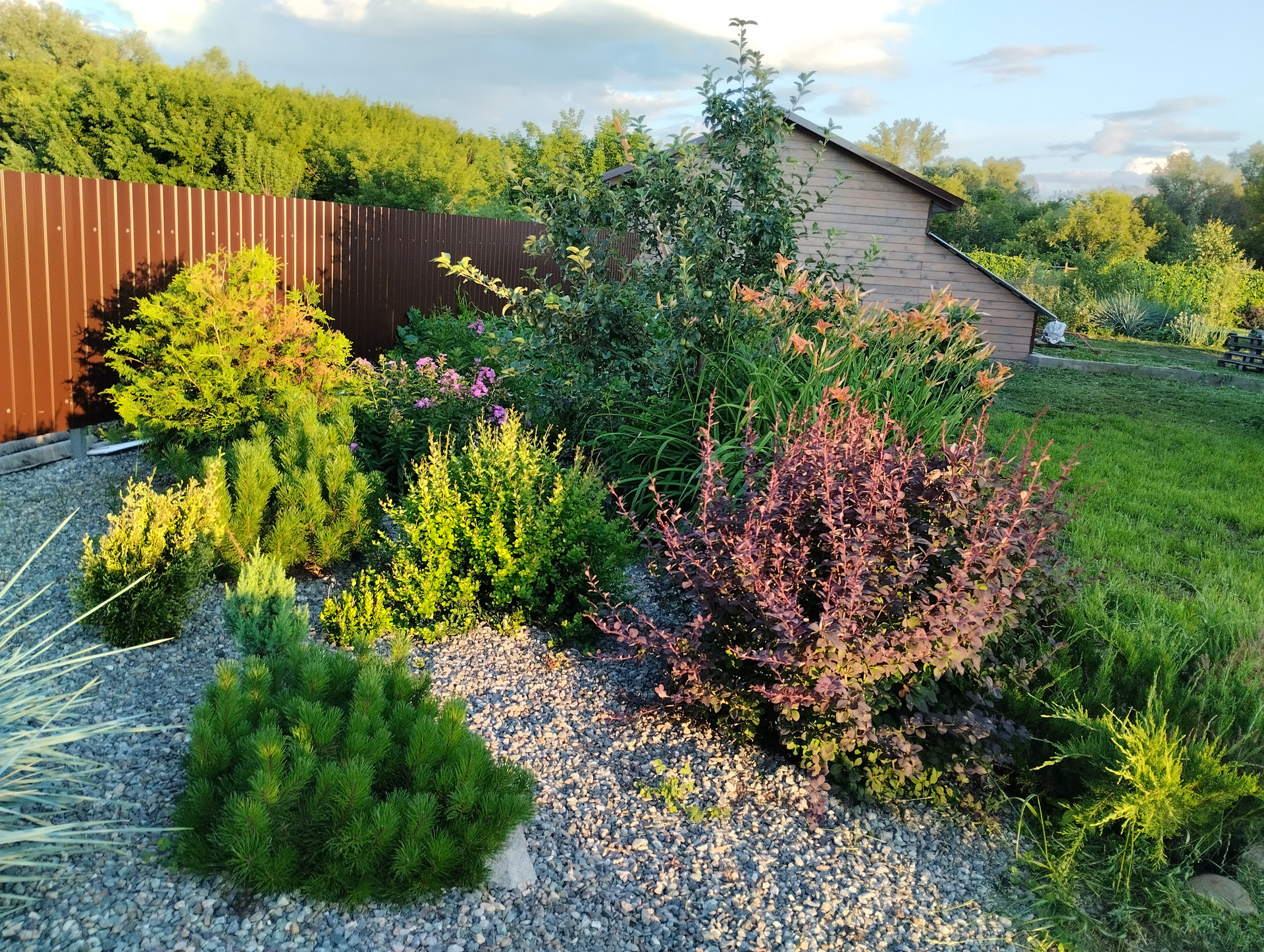 Множество декоративных деревьев,кустарников и цветов.