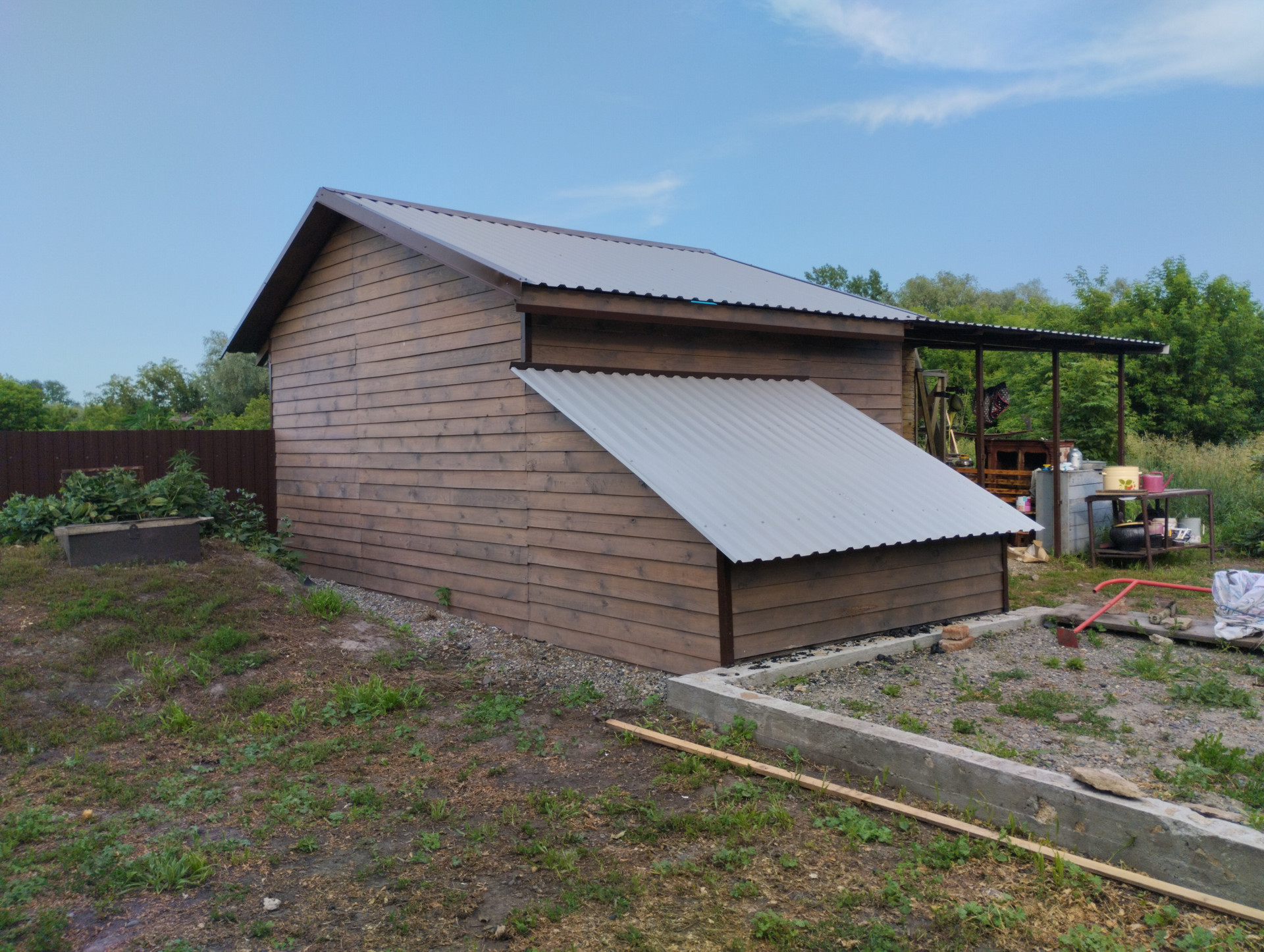 Сарай для дров с навесом и примыкающей угляркой (разрузка угля из машины в короб), уличный туалет.