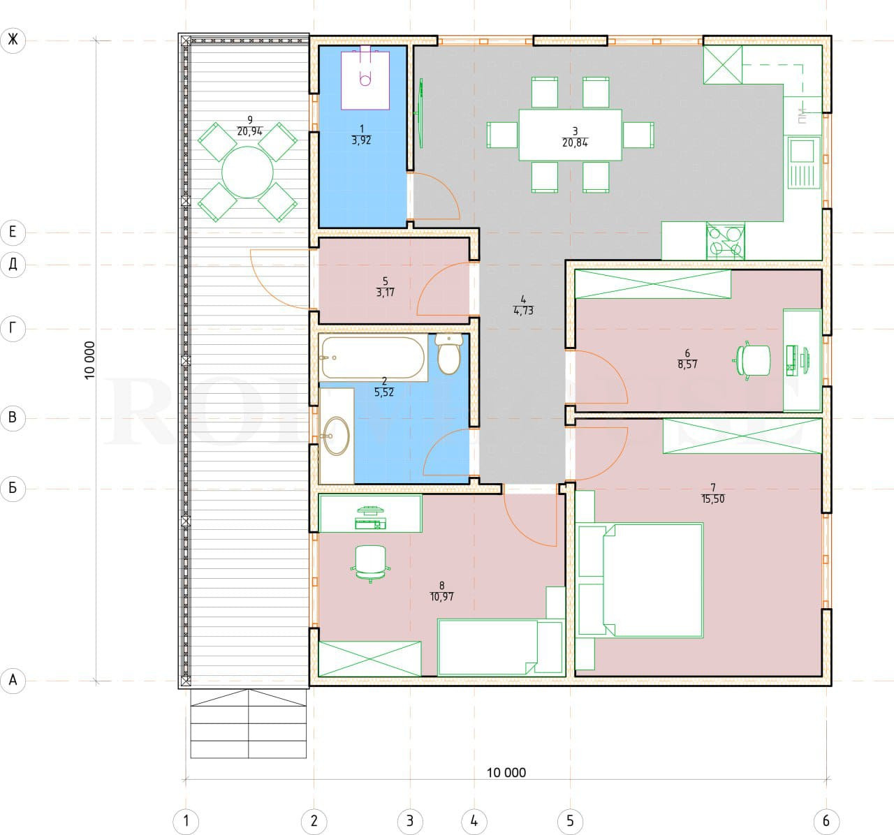Общая площадь-94 кв.м. Размер - 10х10 м