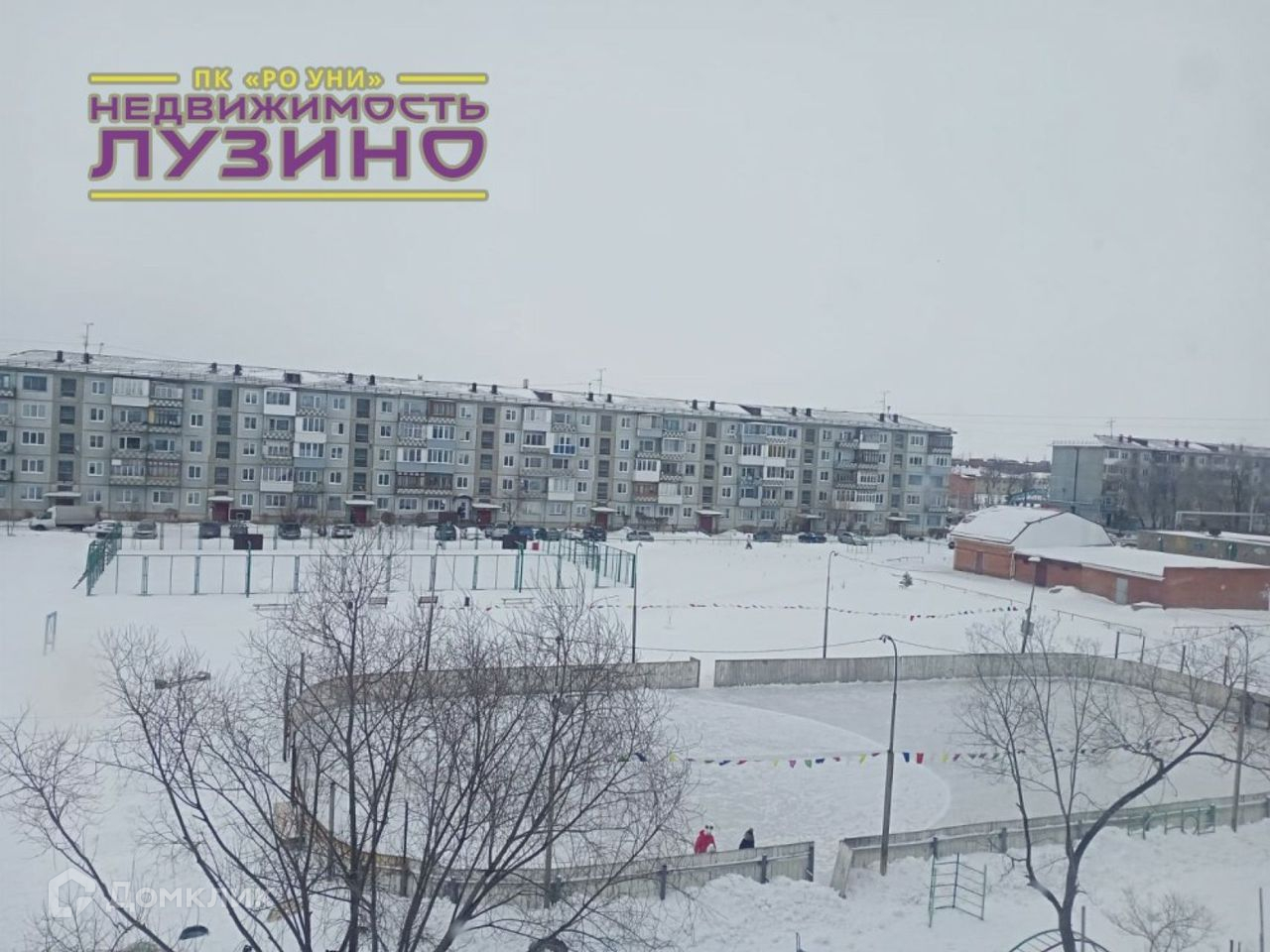 Во дворе спортивная площадка, зимой каток.