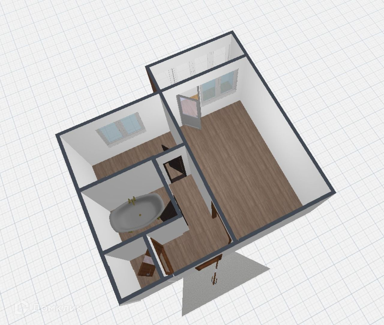 Площадь 36 м2.  Достаточно просторные коридор и кухня.