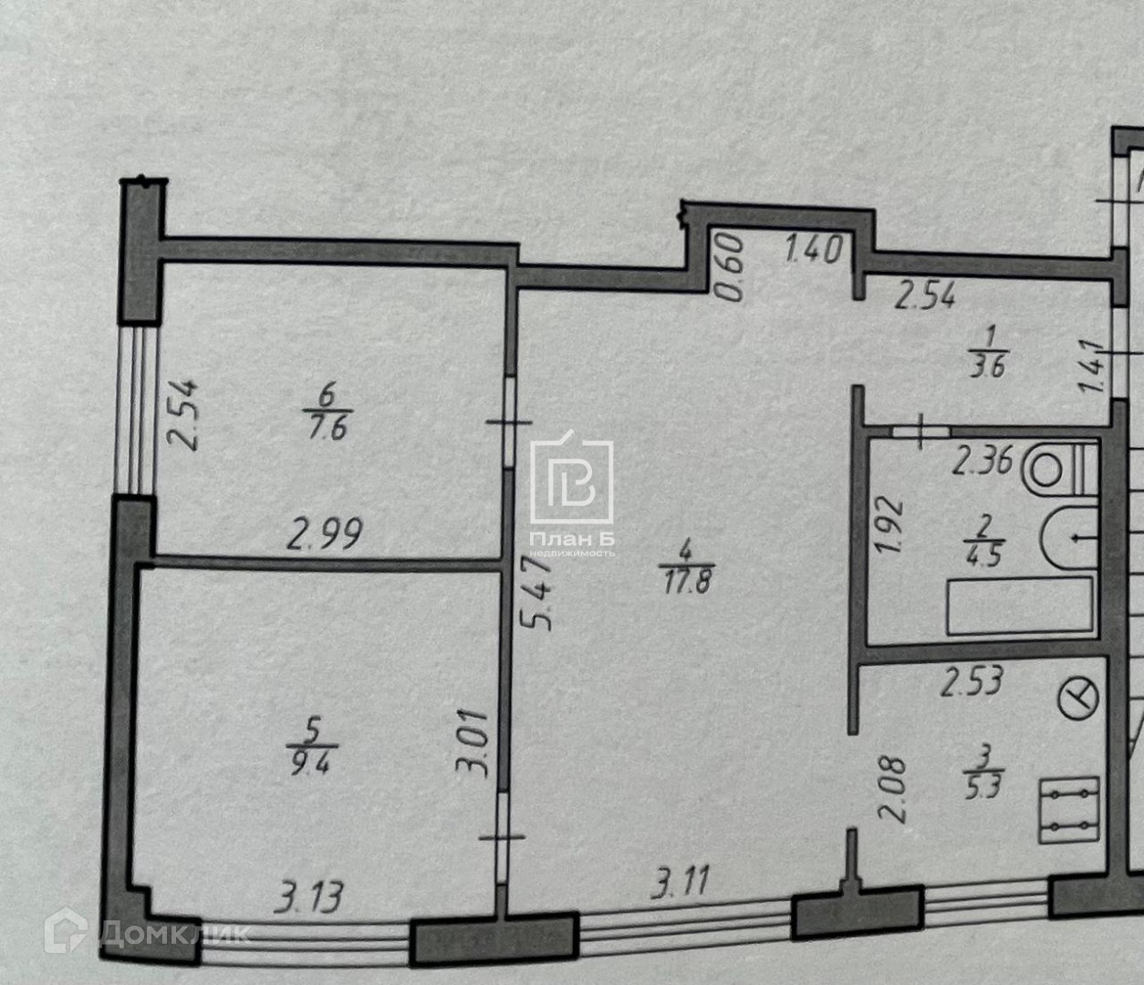 две изолированные комнаты - 9,4 и 7,6 кв.м., гостиная -17,8 кв.м., совмещённый санузел.