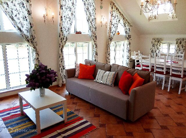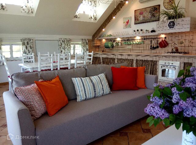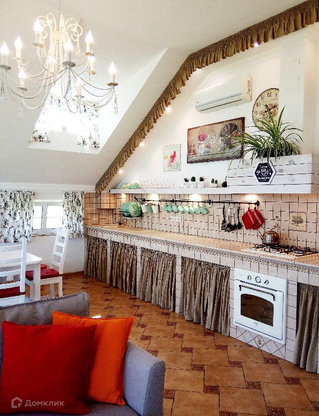 Высота потолка в пике 3,5 м. Много воздуха и света. Современный дизайн (светлый Прованс). Пол - кафель.