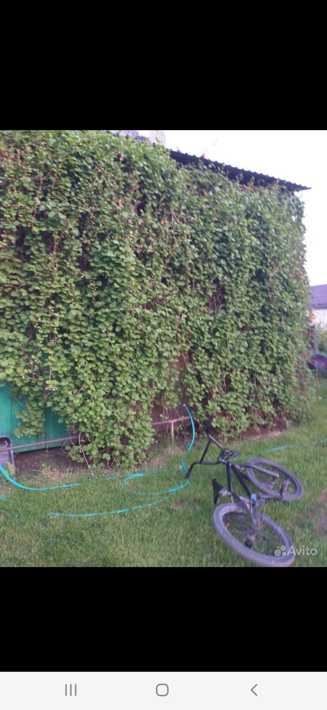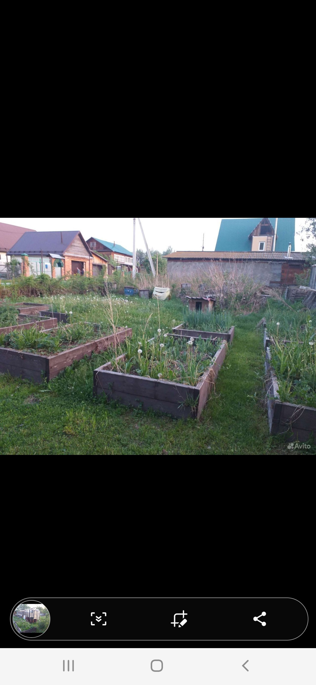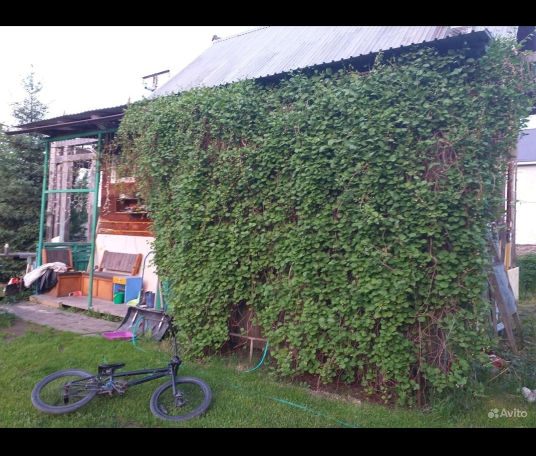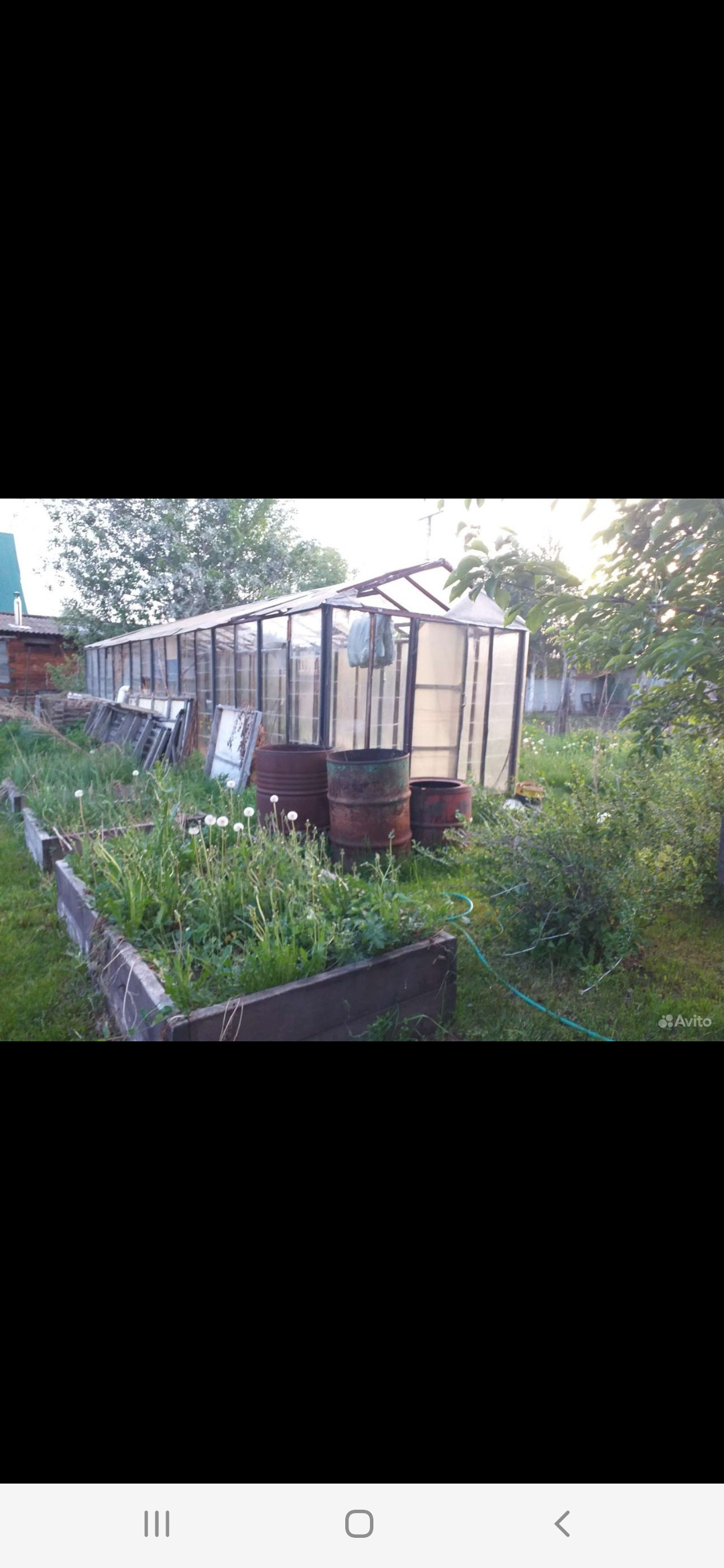 Участок 10 соток, на котором есть теплица, сад (груша, яблони, ирга, орех, вишня, крыжовник, малина), огород, вольер для собаки.
