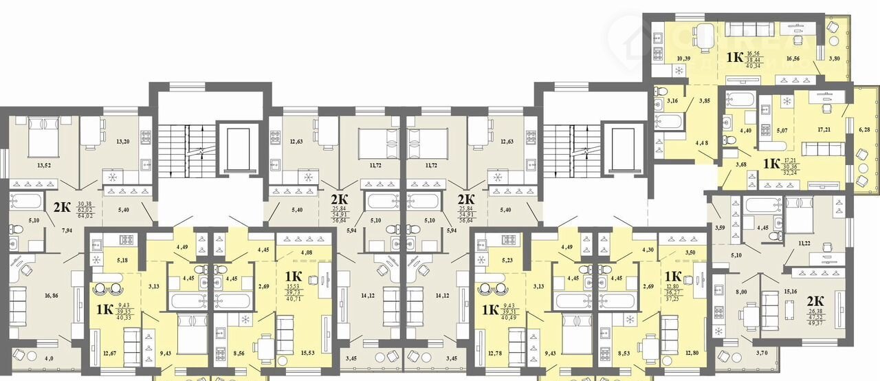 однокомнатные квартиры и одна из комнат двухкомнатных квартир ориентированы на юго-