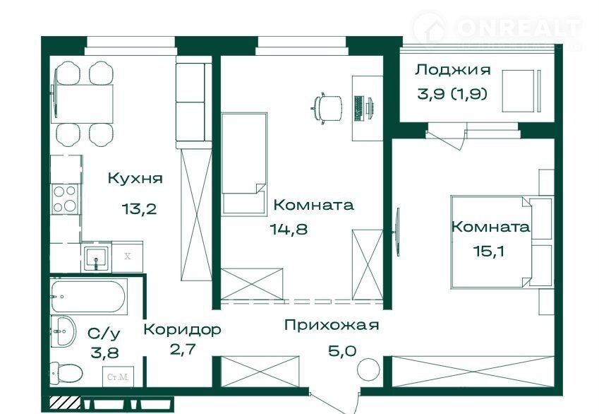 Общая площадь 56.5 м2
