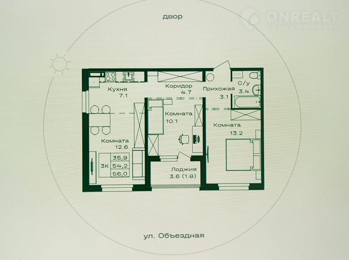 Общая площадь 56 м2