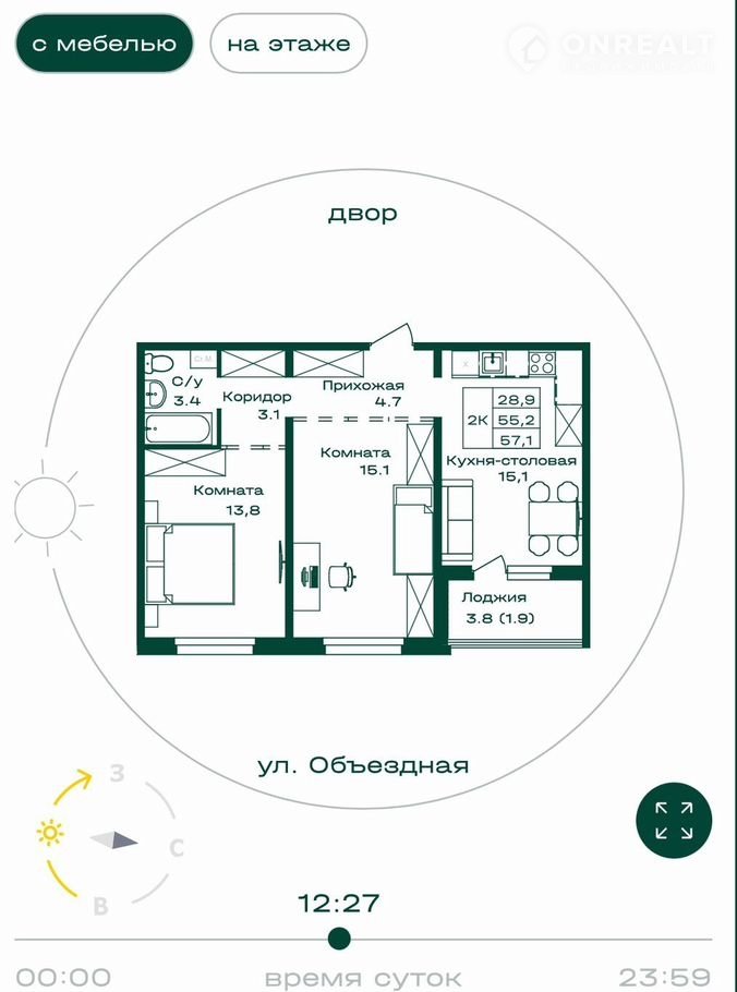 Общая площадь 57.1 м2