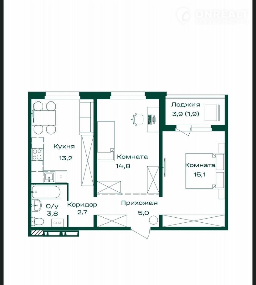 Общая площадь 56.5 м2