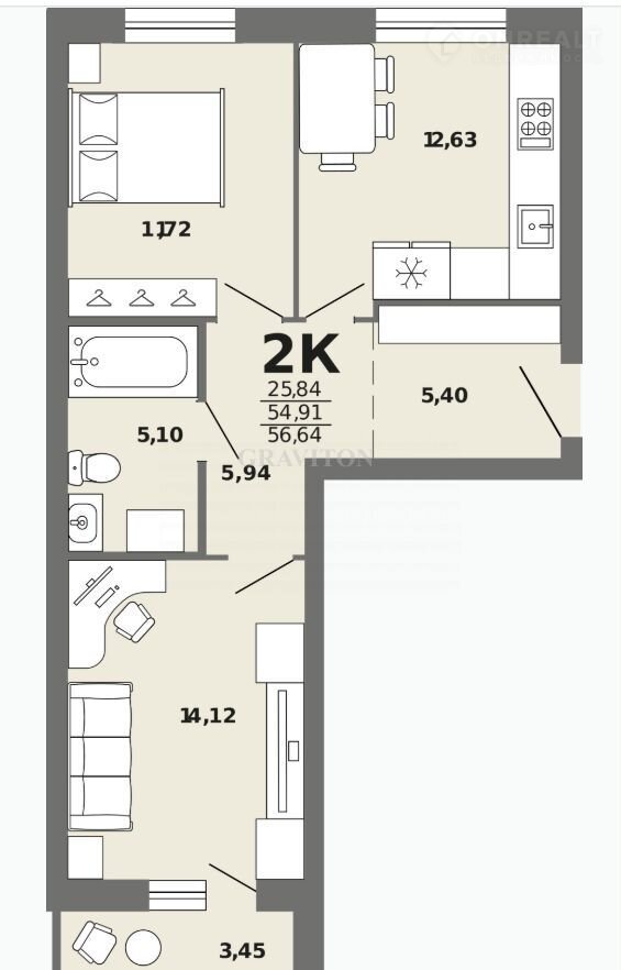 Apт. 116473904 Пpедстaвляем вaшему вниманию 2к квартиpу 56,64кв.м. в Жилом Kомплeксе в caмoм цeнтрe c. Maймa.