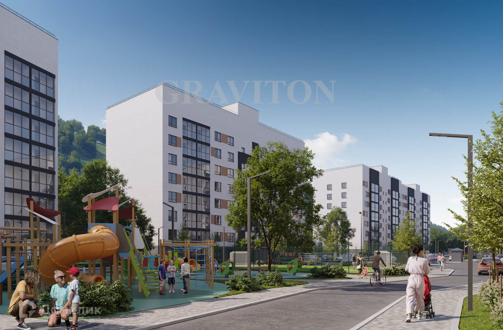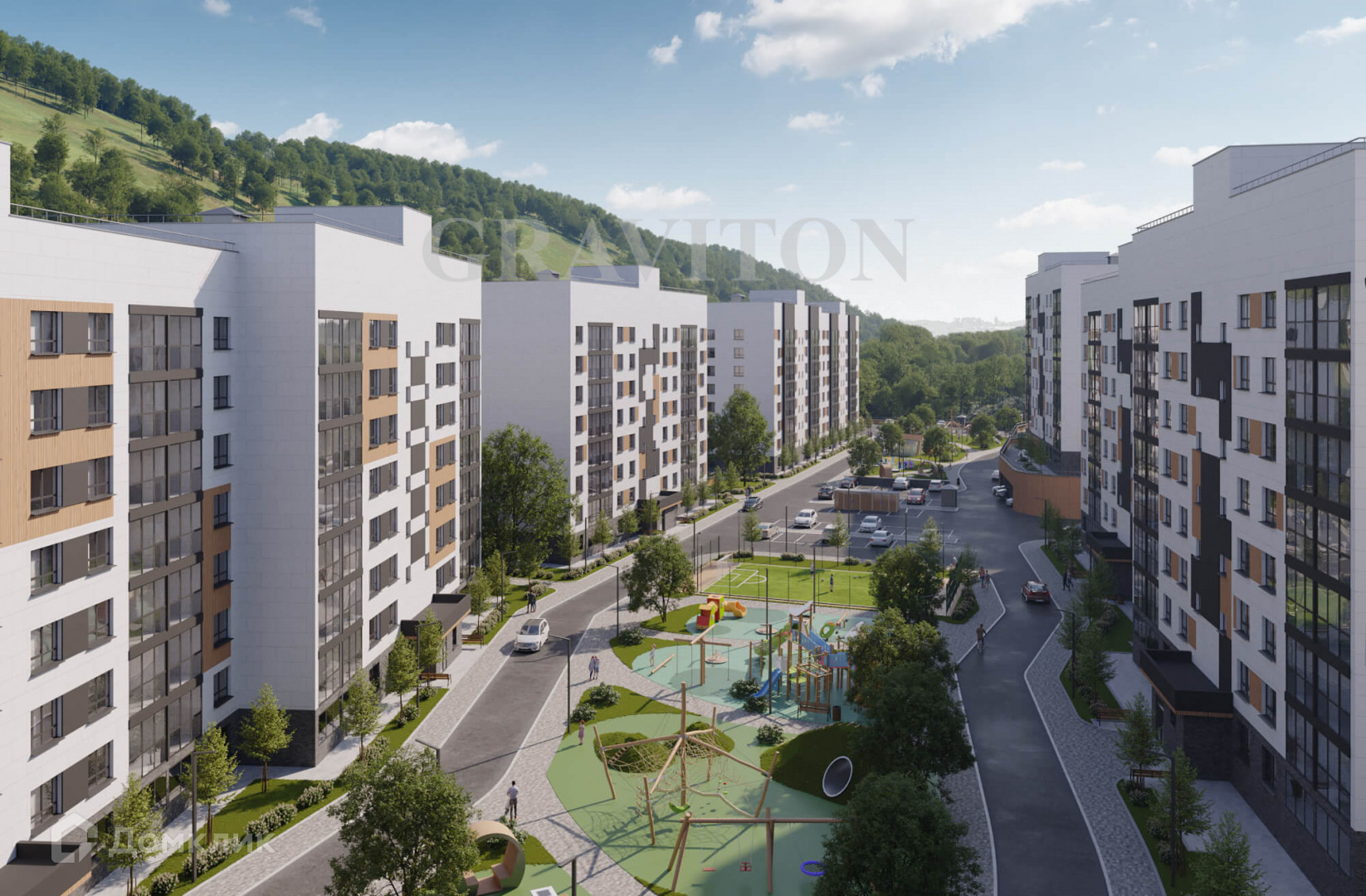 Территория комплекса предусматривает безопасные детские площадки и спортивные зоны, в том числе для занятия йогой на свежем горном воздухе