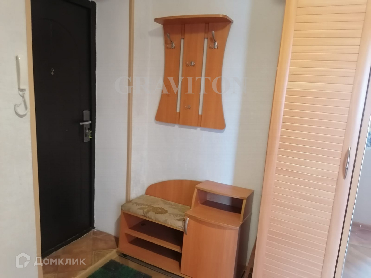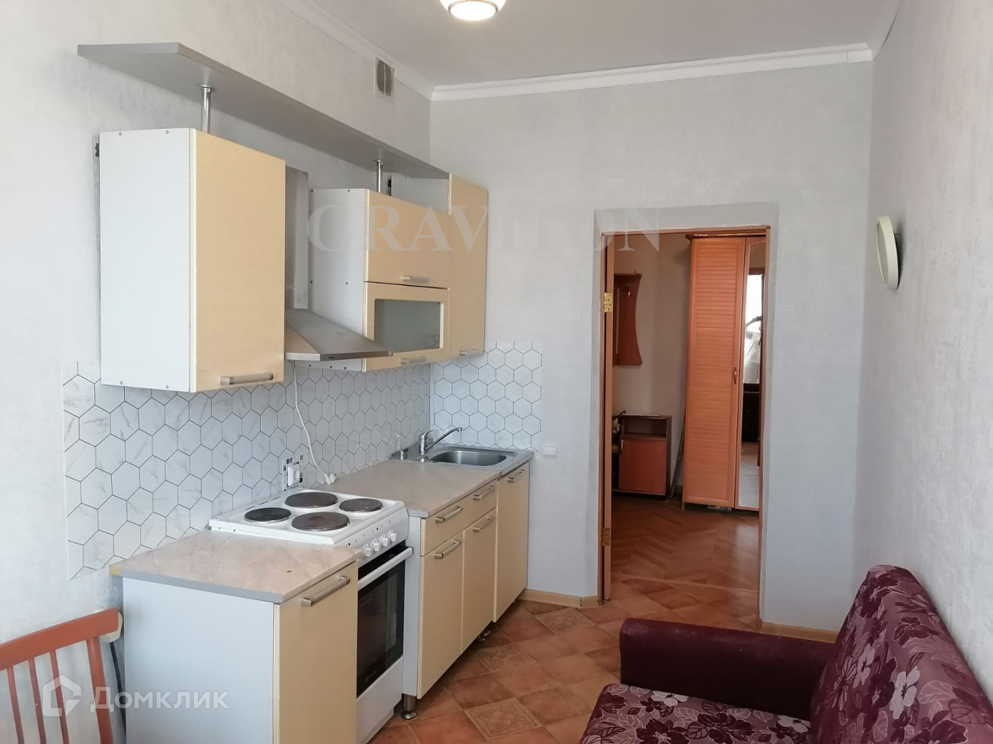 Комната светлая - есть удобный диван, комод. На кухне имеется гарнитур, четырехконфорочная плита, вытяжка, столик со стульями и диванчик для отдыха. Санузел совмещенный, установлены счетчики для воды. В прихожей есть большой шкаф-купе, пуфик и вешалка с тумбочкой.