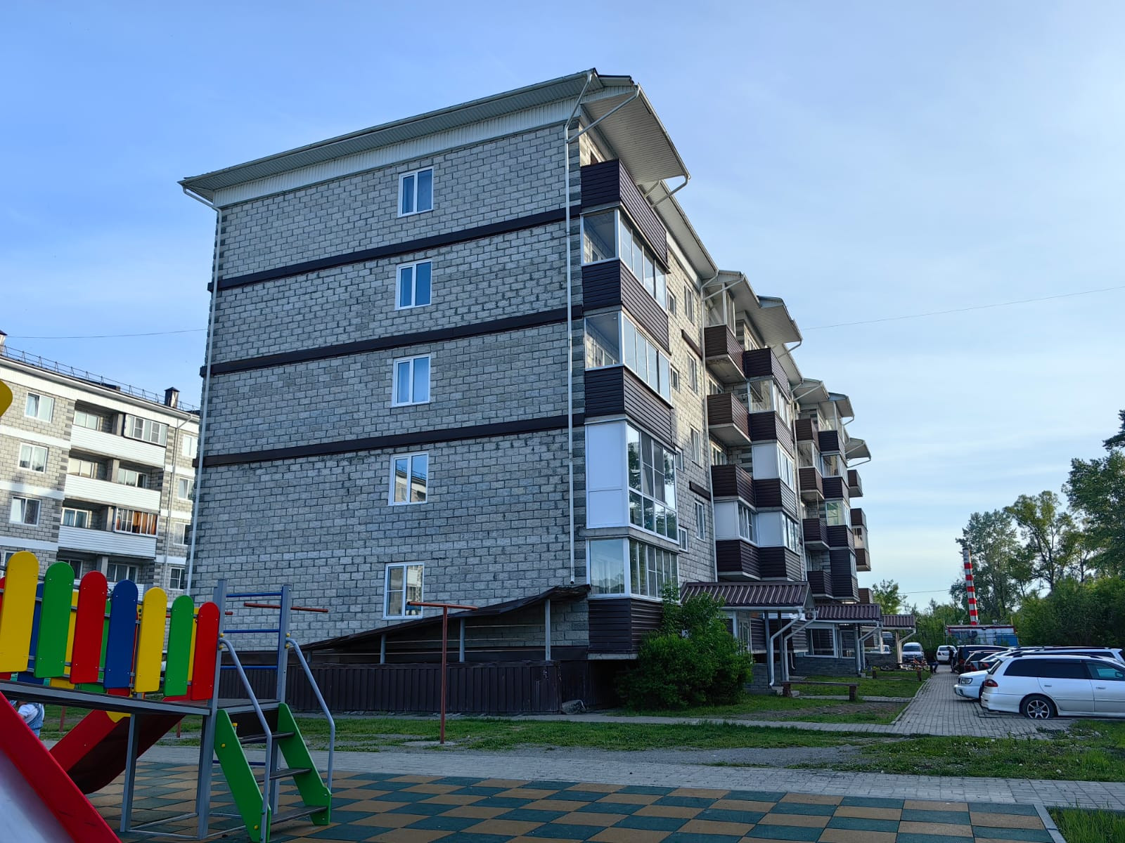 Большая парковка во дворе, детская площадка.