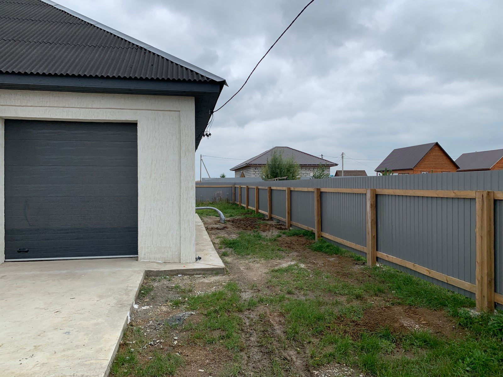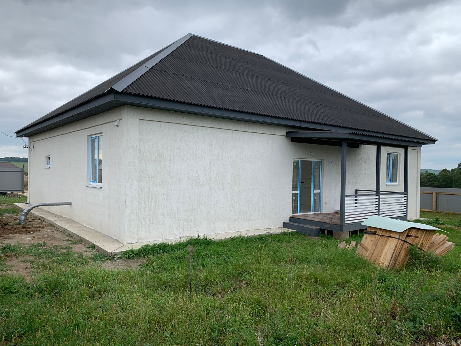 Стены под обои, облицовка короед, крыша конверт(Ондулин). 5ти камерные стеклопакеты. Полы в кухне и гостиной - космографии, полы в спальнях - ламинат. Планировка:3 спальни, гостиная, отдельная кухня и гараж на одну машину, санузел совмещенный. Фундамент из бетона м300. Газоблок Байкальский, стены 30, см перегородки 10см, две несущие 20 см. Гаражные ворота и откатные на электроприводе. Скважина 76 метров трубы + 8 метров. Септик 6м3. Участок 8 соток, электричество официальное(лицевой счет, пульт, акт) , уведомление о начале строительства есть, о завершении будет после окончании стройки.  Есть возможность, за отдельную плату, присоединить участок 8 соток. Дом построен из качественных материалов, фото и видео поэтапной стройки  вышлю по запросу.