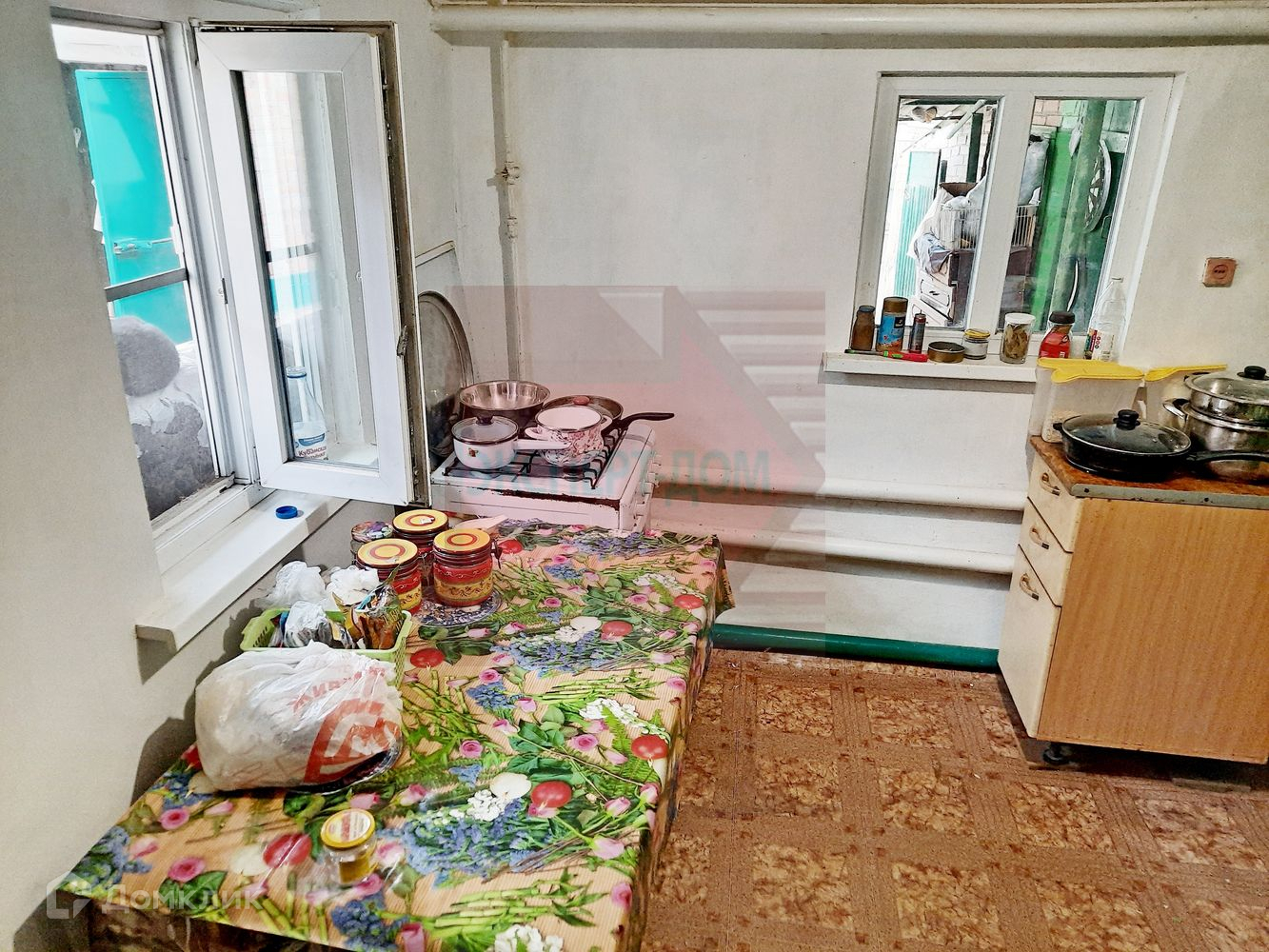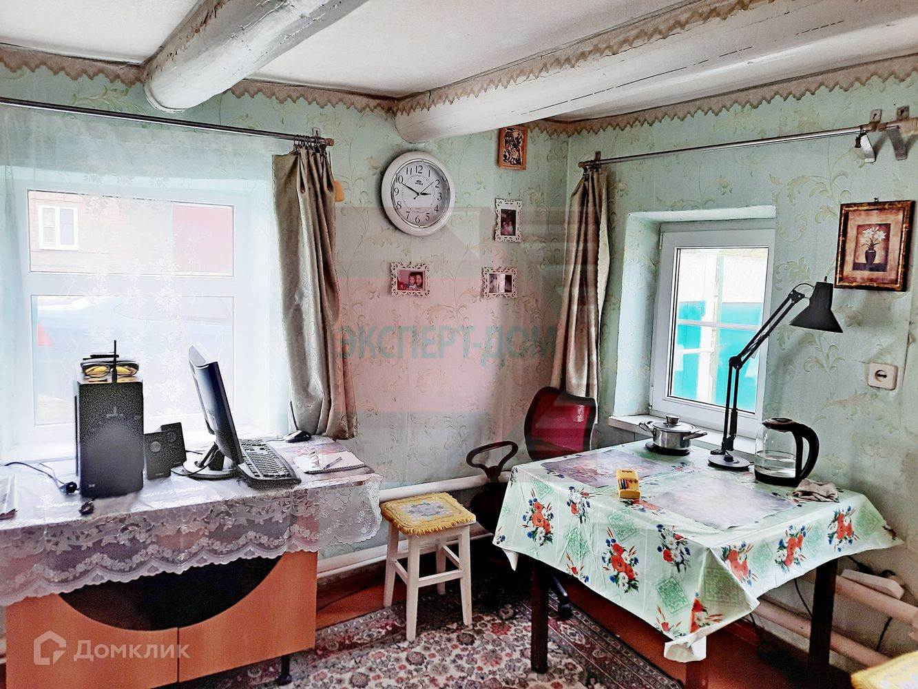 Дом саманный, обложен кирпичом. Крыша шифер. Окна деревянные. Полы деревянные крашеные. Стены и потолки крашеные.