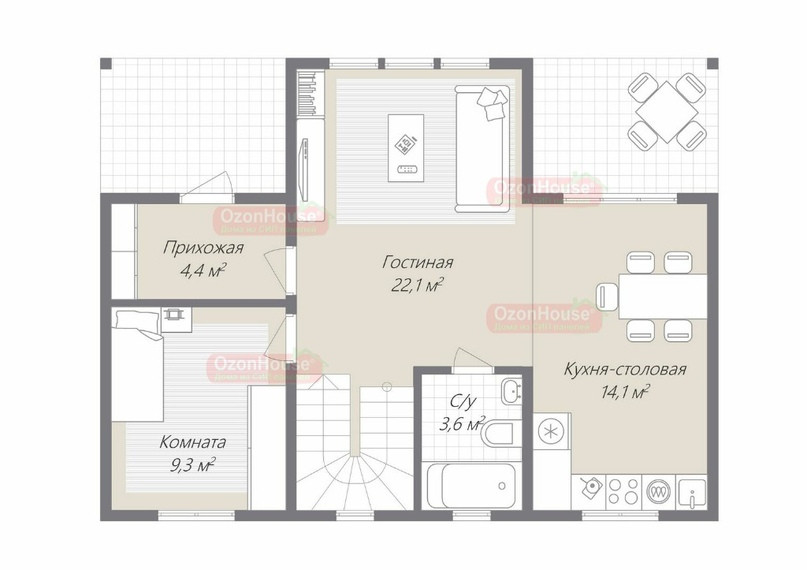 Просторная и светлая за счет панорамных окон со стороны сада гостиная станет отличным местом для времяпрепровождения с семьей и друзьями в теплое время года.
