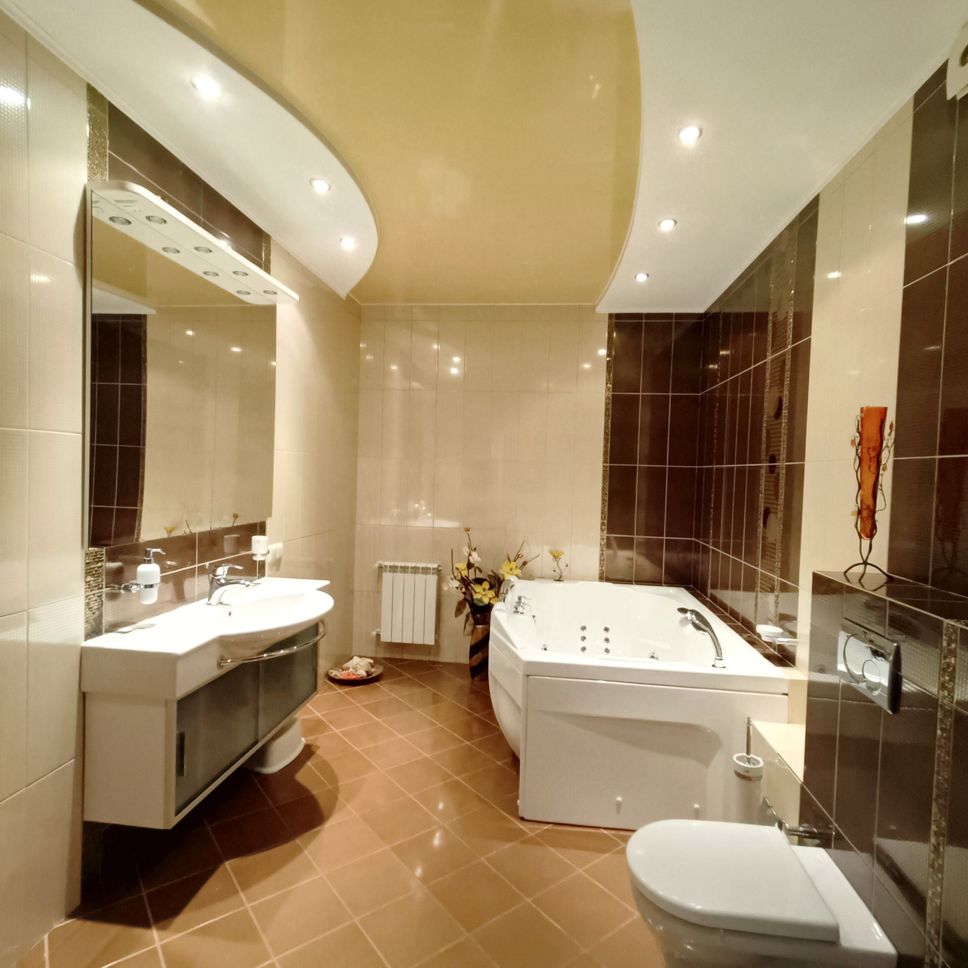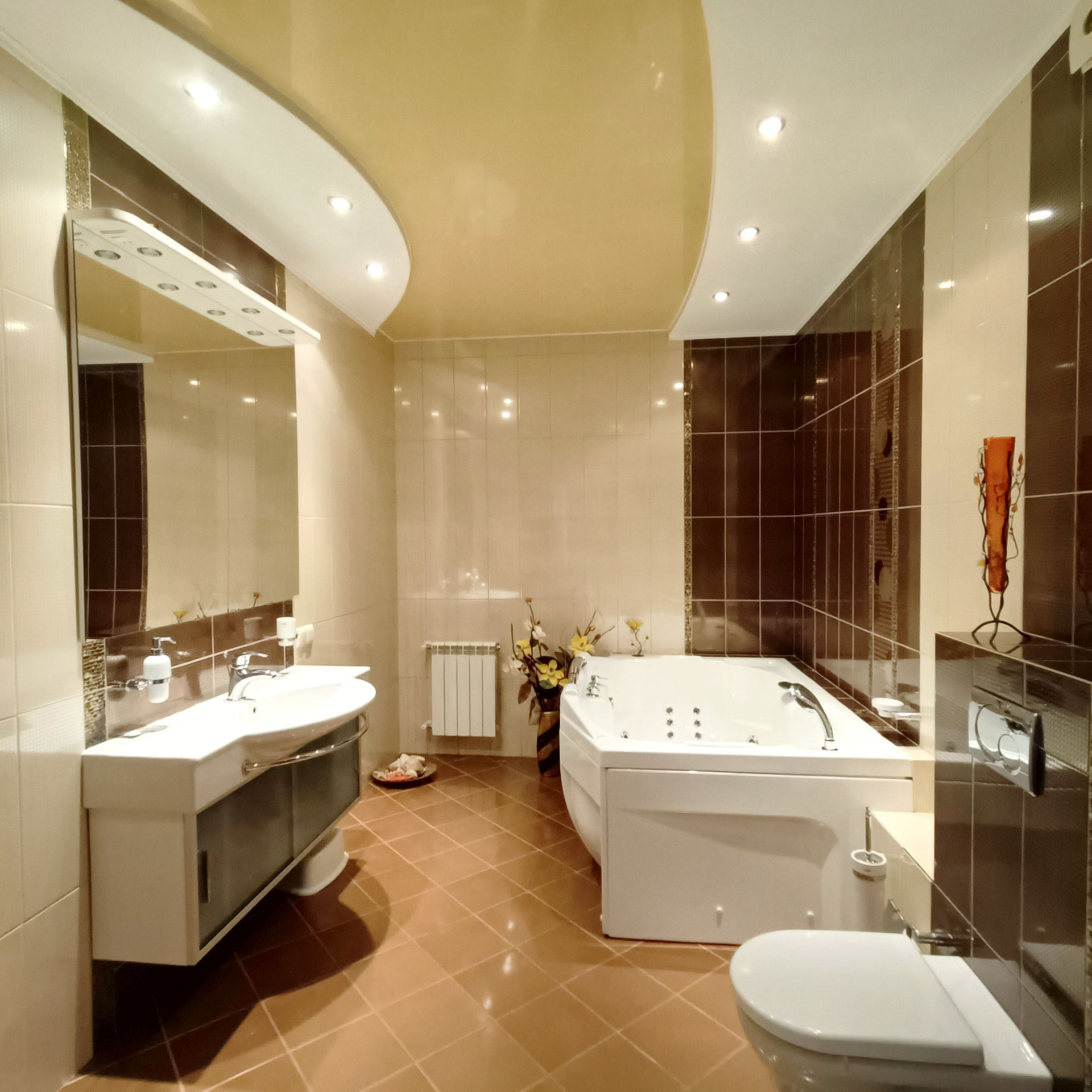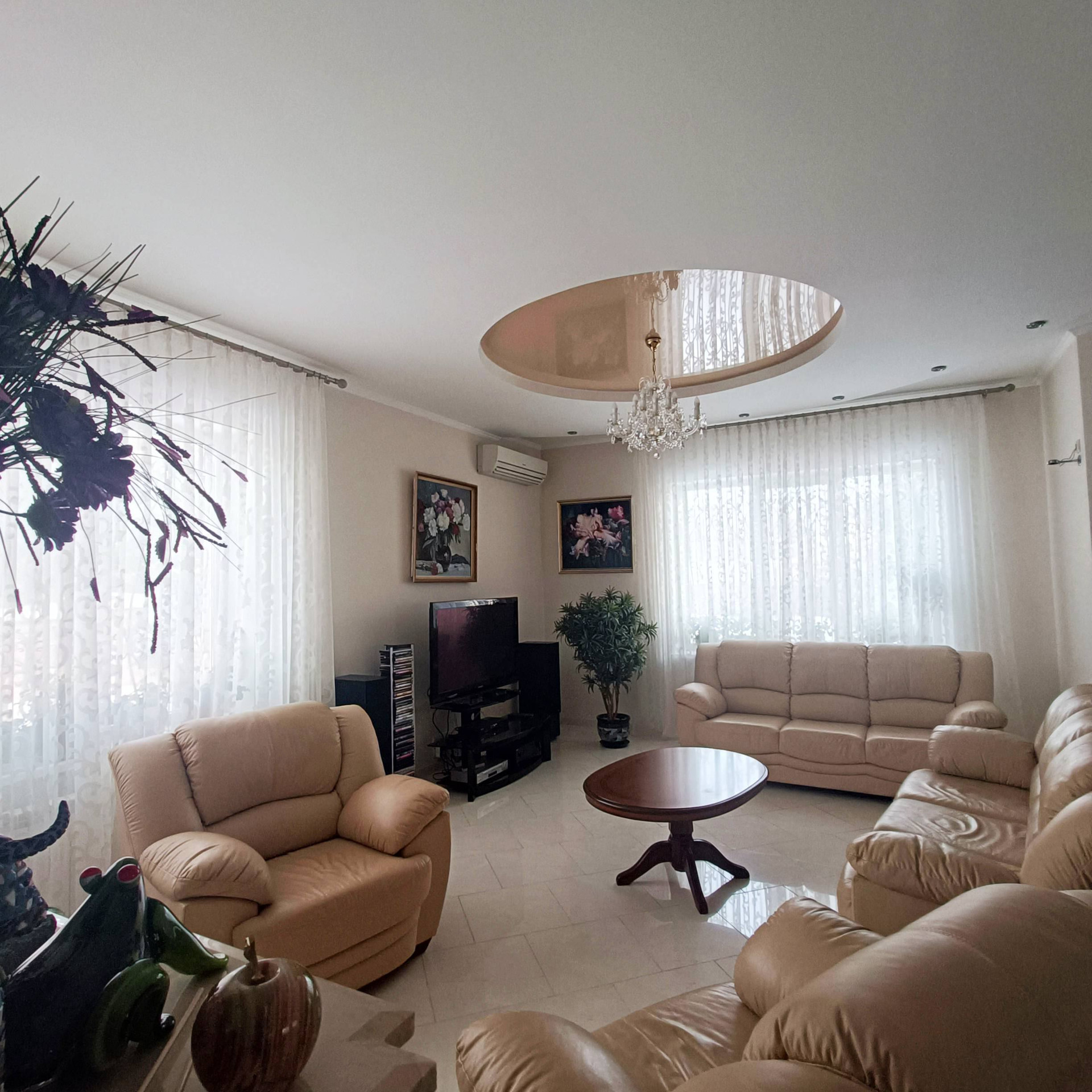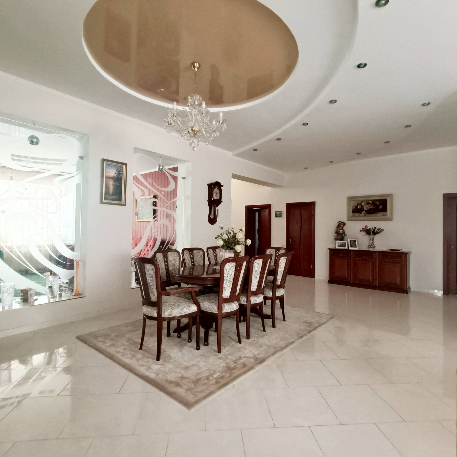 На 1 этаже прихожая, просторная гостиная с камином и мраморным полом с водяным отоплением, кухня, бильярдная, гостевой санузел, гардеробная со шкафами купе, кабинет гостевая с санузлом.