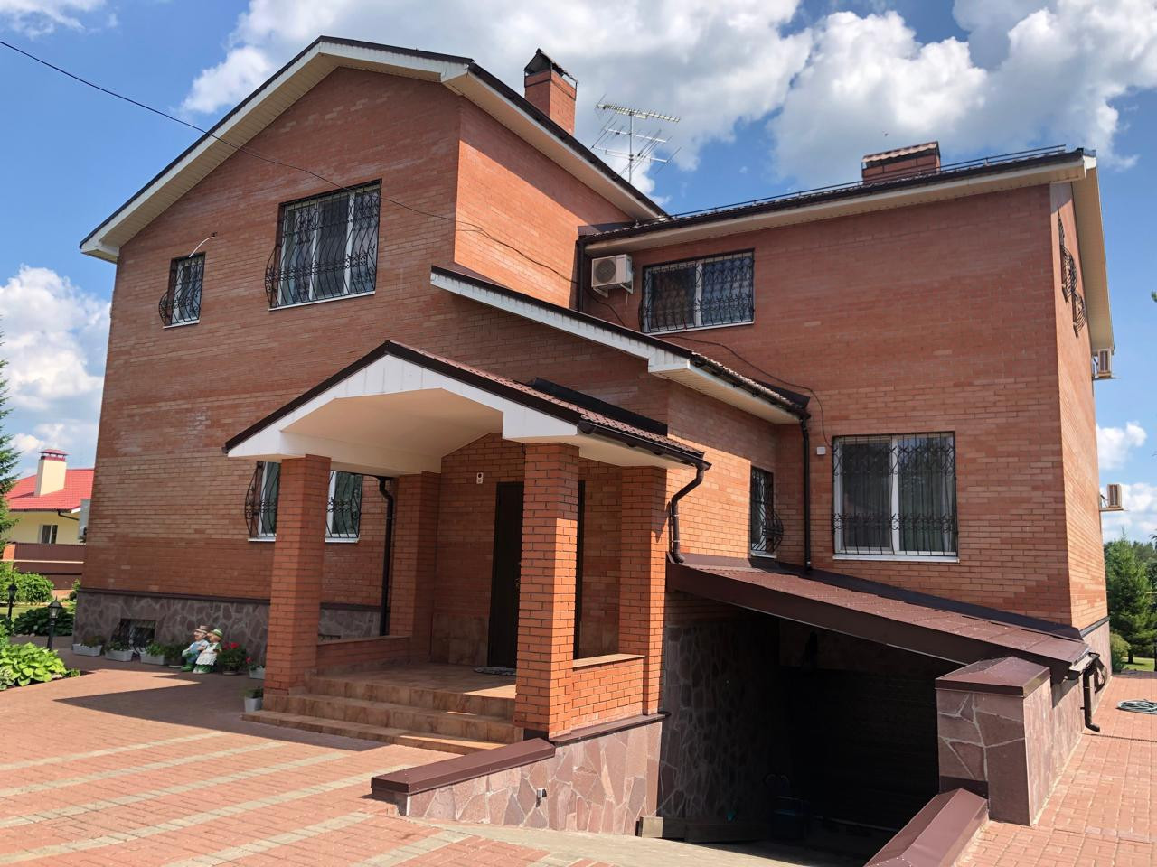 Тротуары и пешеходные зоны с местным освещением выложены брусчаткой. Во дворе парковка для автомобилей.
