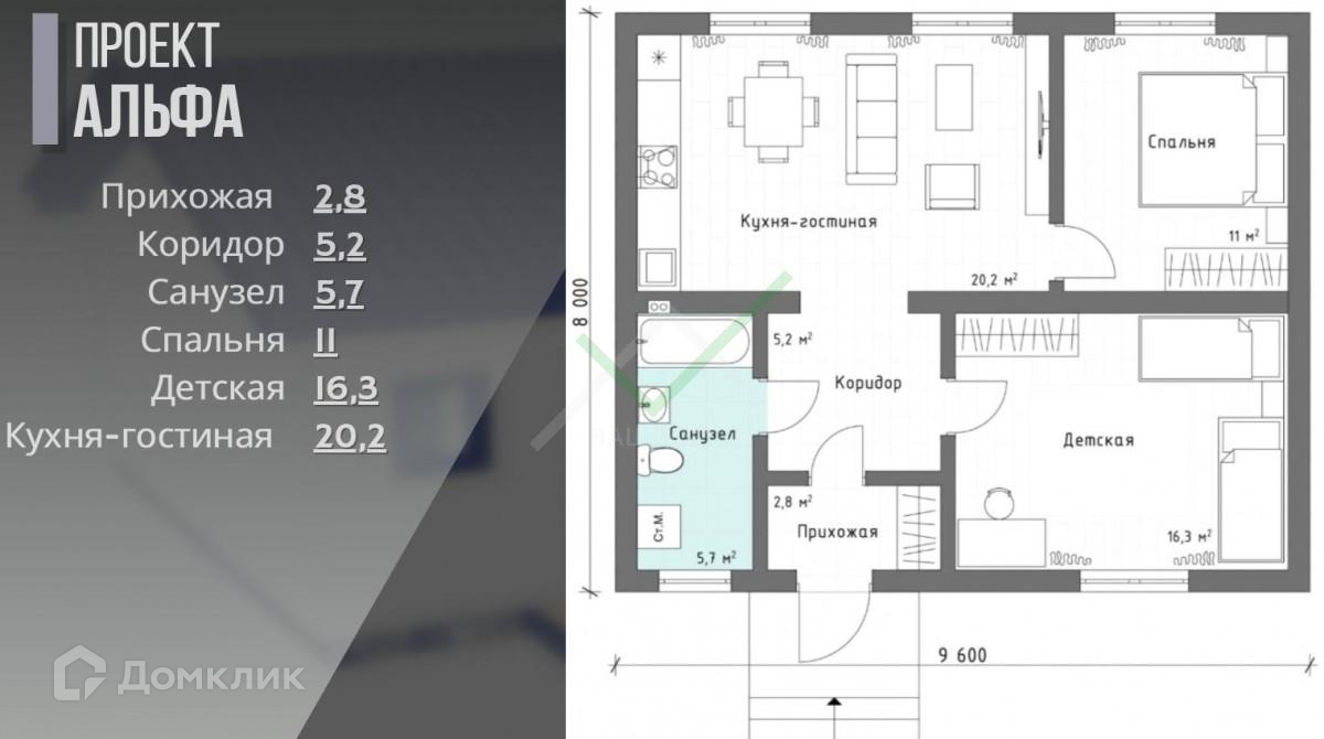 В доме 2 просторные комнаты, кухня-гостинная (20.2 кв. м), большой сан.узел (5.7 кв.м.)