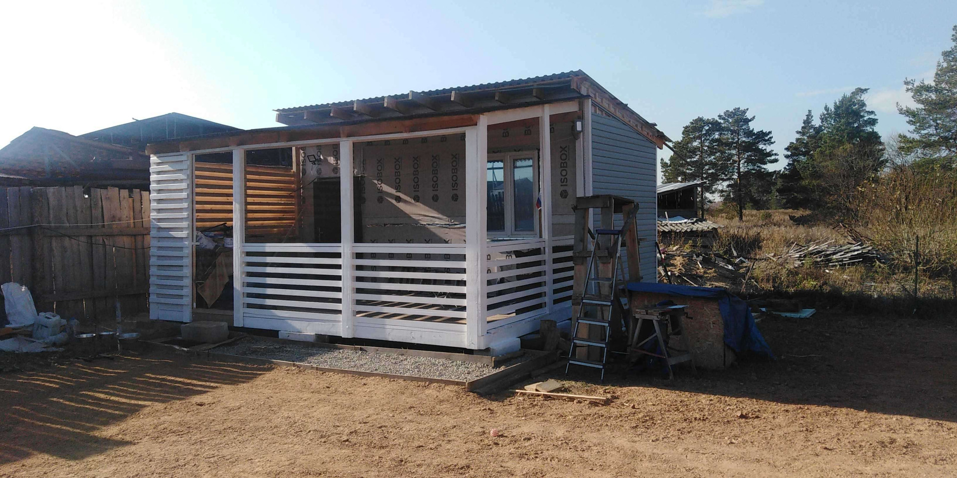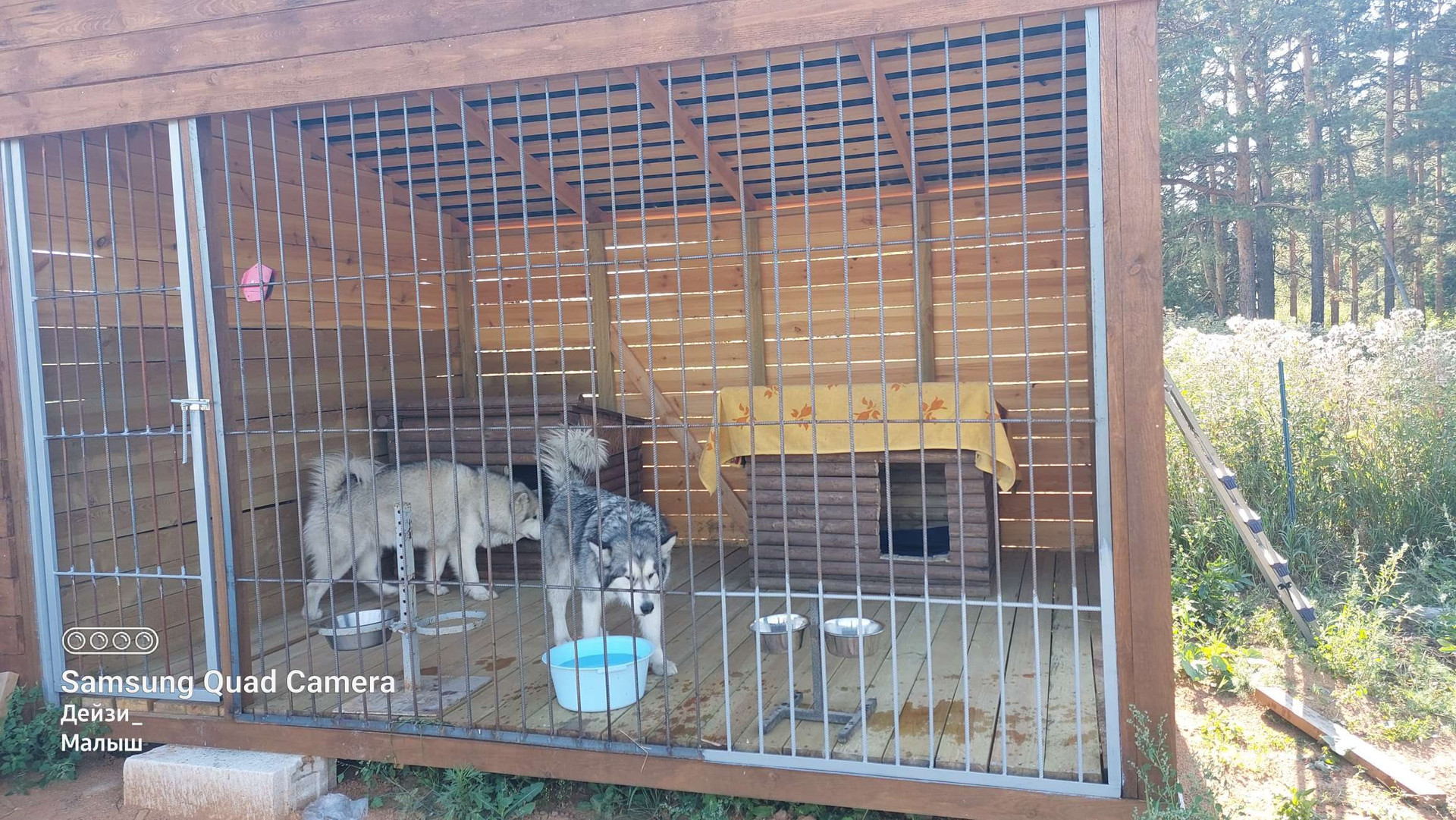 На участке вольер для собак совмещённый со складом(вольер 3х4 можно переделать под помещение склад, склад 2х3 возможно объединить), сарай открытый для инвентаря.