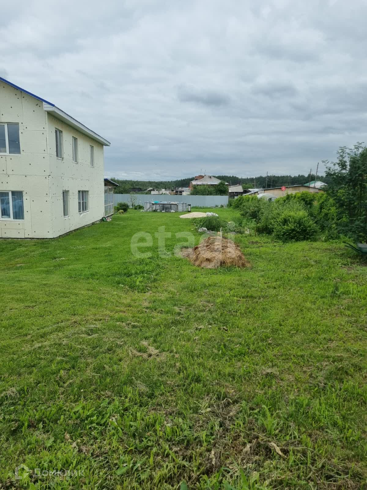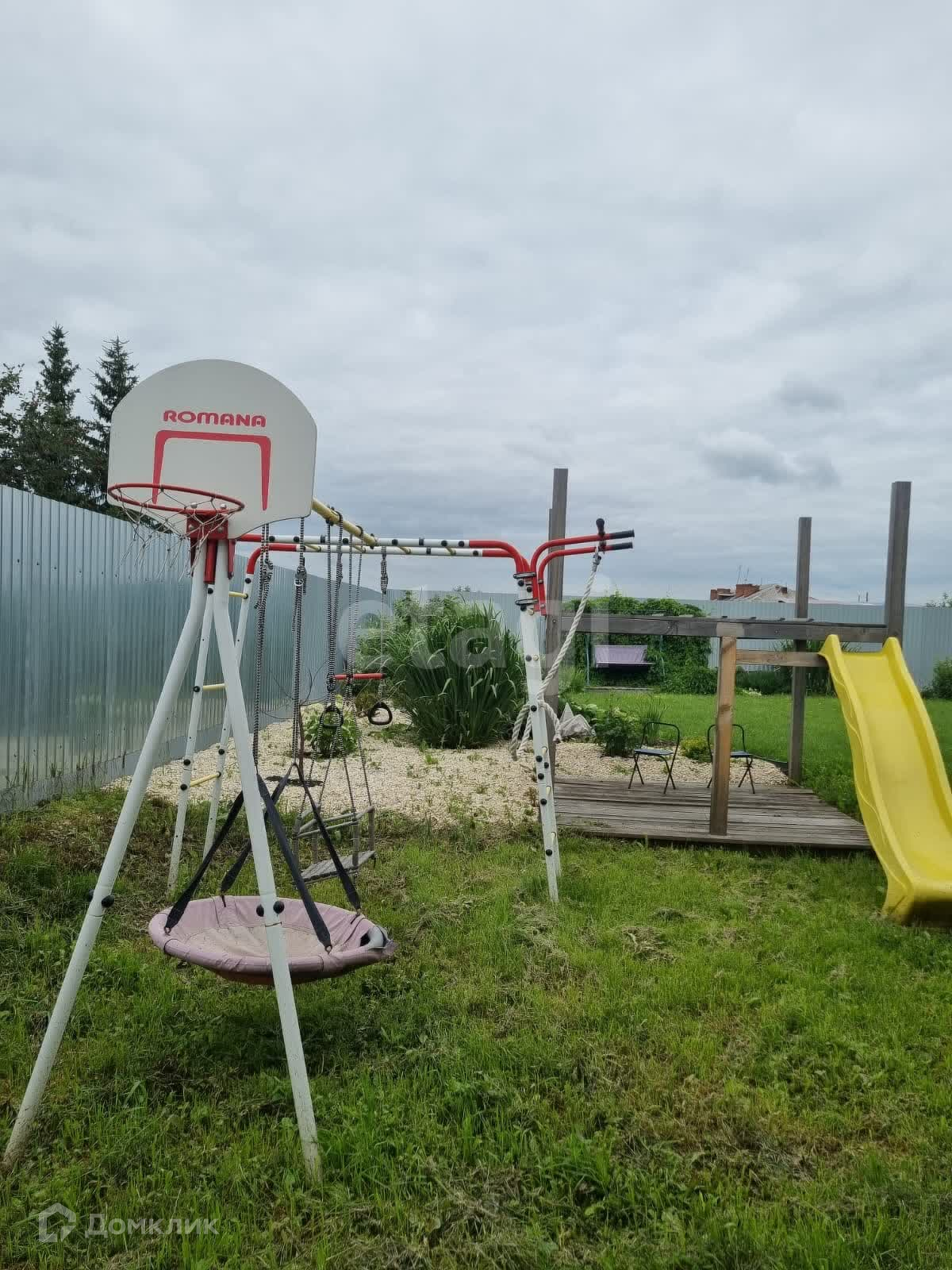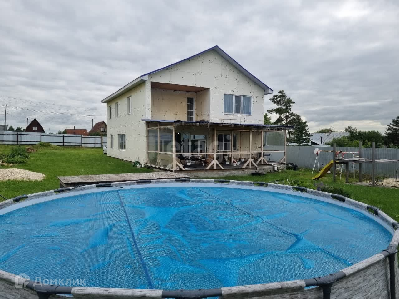 На участке каркасный бассейн 550см в диаметре, капитальный детский комплекс. Территория участка ограждена забором.
