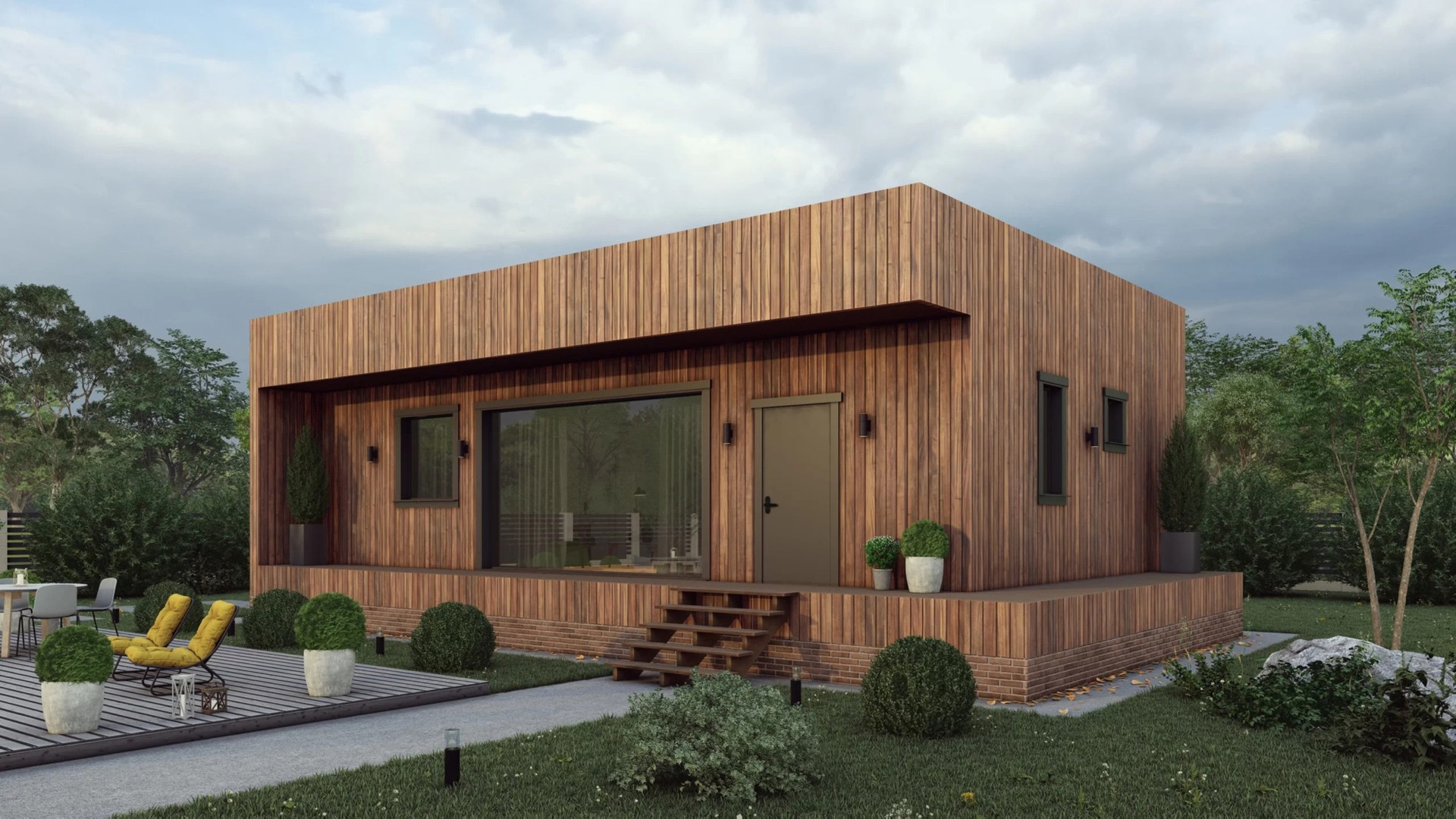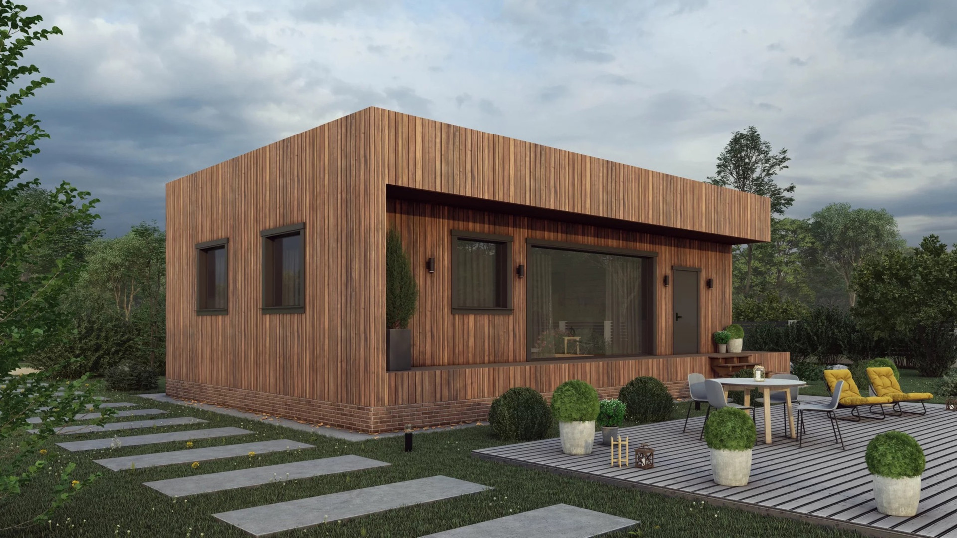 Современный дом с двумя спальнями и террасой, для круглогодичного проживания небольшой семьи из 2-3 человек. Высота потолков 2,6 метра.
