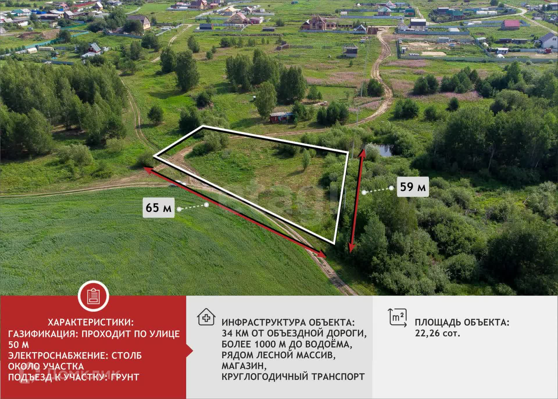 Участок не огорожен, обработан, имеет ровный рельеф. Рядом с участком стоит столб для подключения электричества, газ в 50-ти м от участка. Достаточно привлекательный район с точки зрения возведения загородного жилья, в том числе постройки коттеджного посёлка. Новая застройка, соседи активно строятся. Сам участок расположен в живописном месте в сочетании водоёма и леса, в дали от городской суеты, вокруг сосновый бор, прекрасные грибные и ягодные места, рыбалка.