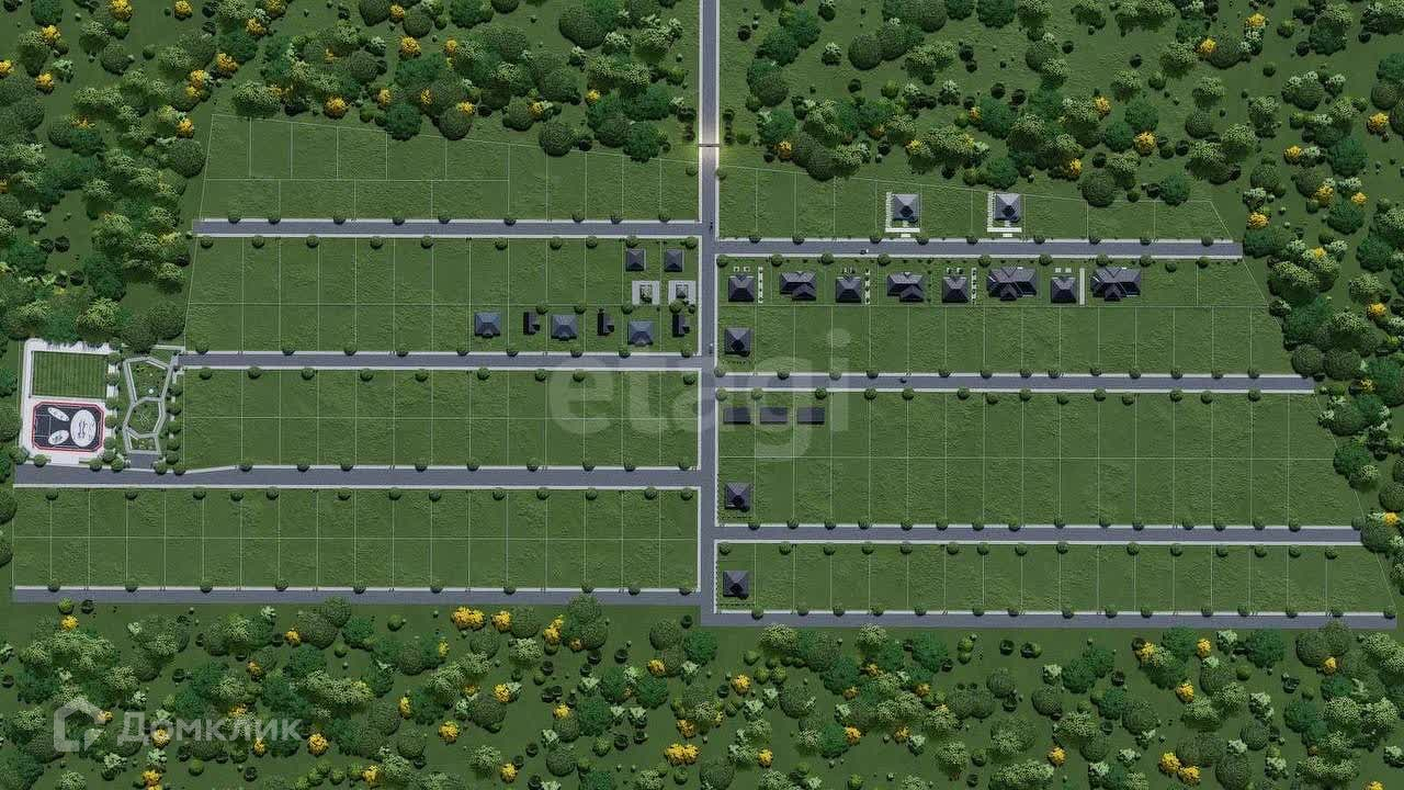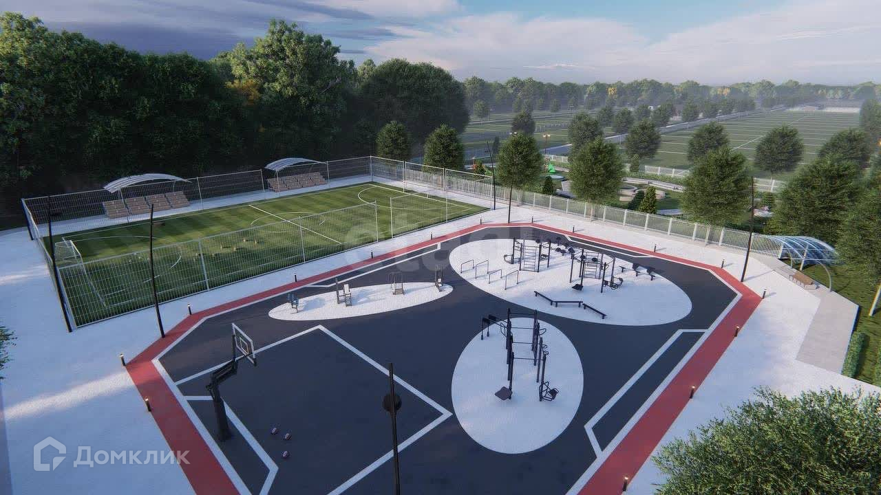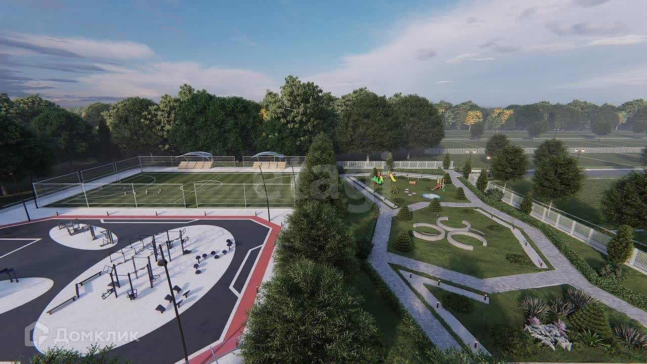 Современный благоустроенный поселок с детской площадкой, парком для прогулок, футбольным полем, асфальтированной парковкой на 40 мест.