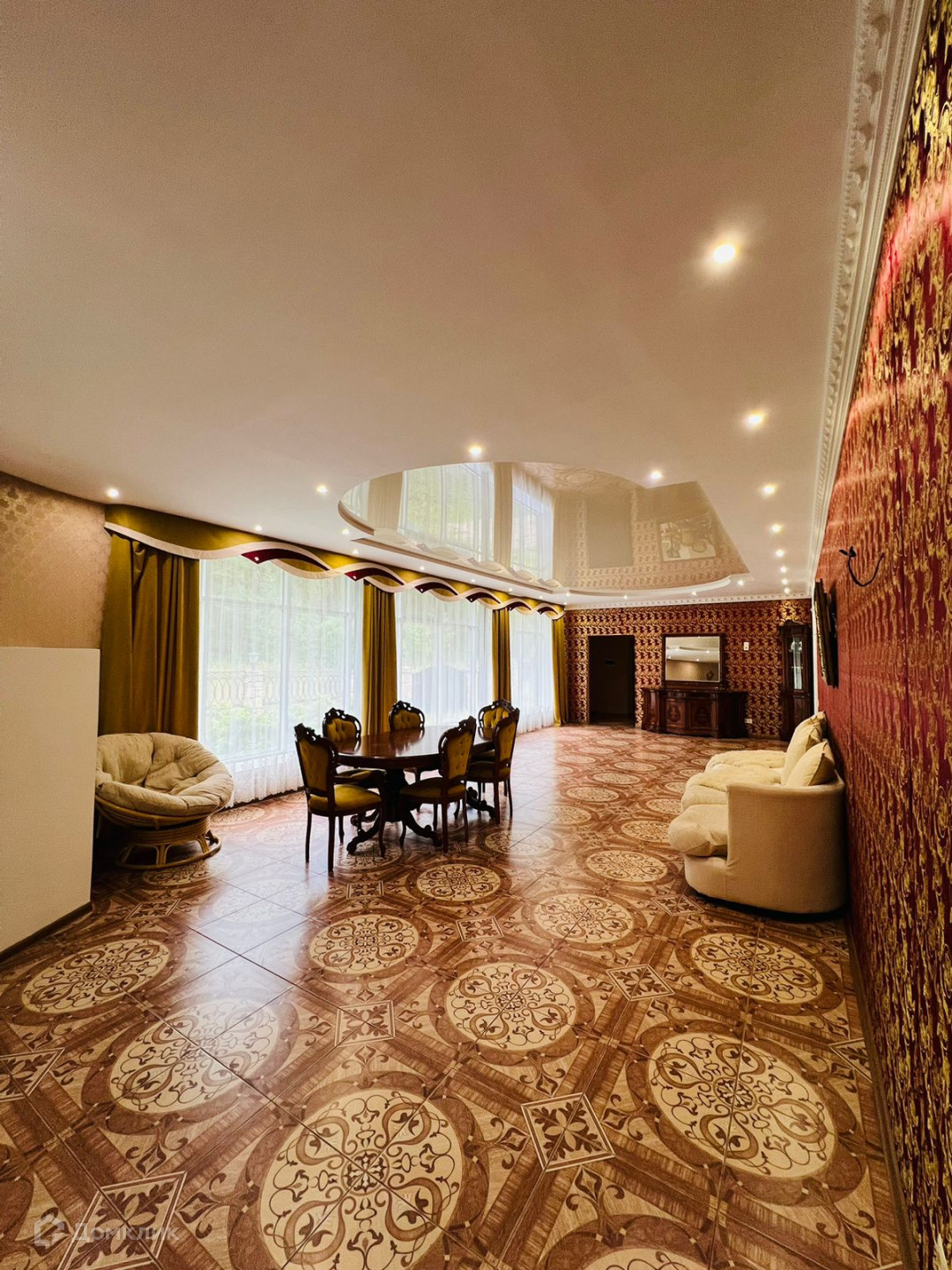 На первом этаже находятся: тамбур, прихожая, санузел, огромная гостиная с русской печью и камином, большая кухня, холл, выход на задний двор из гостиной.