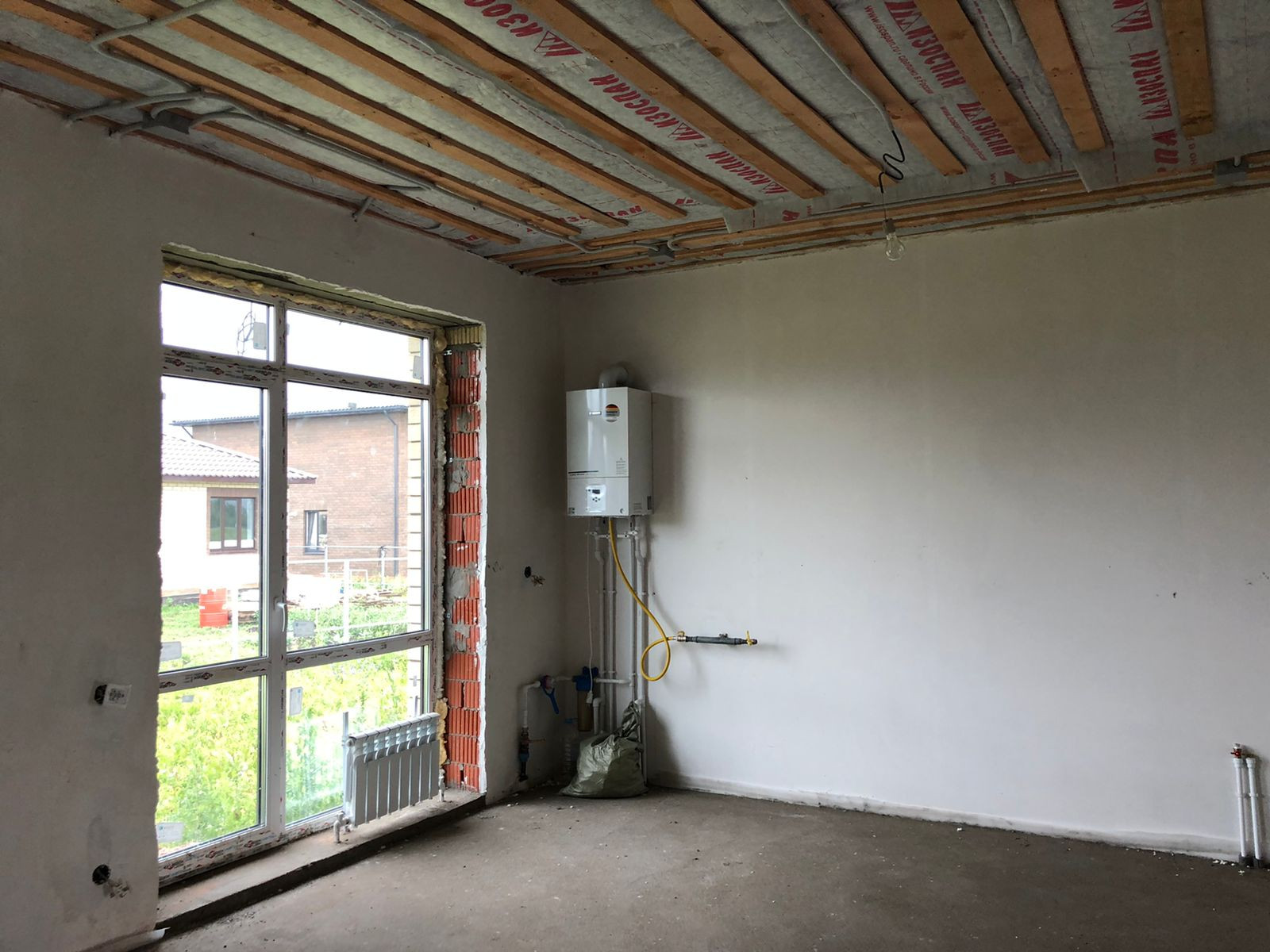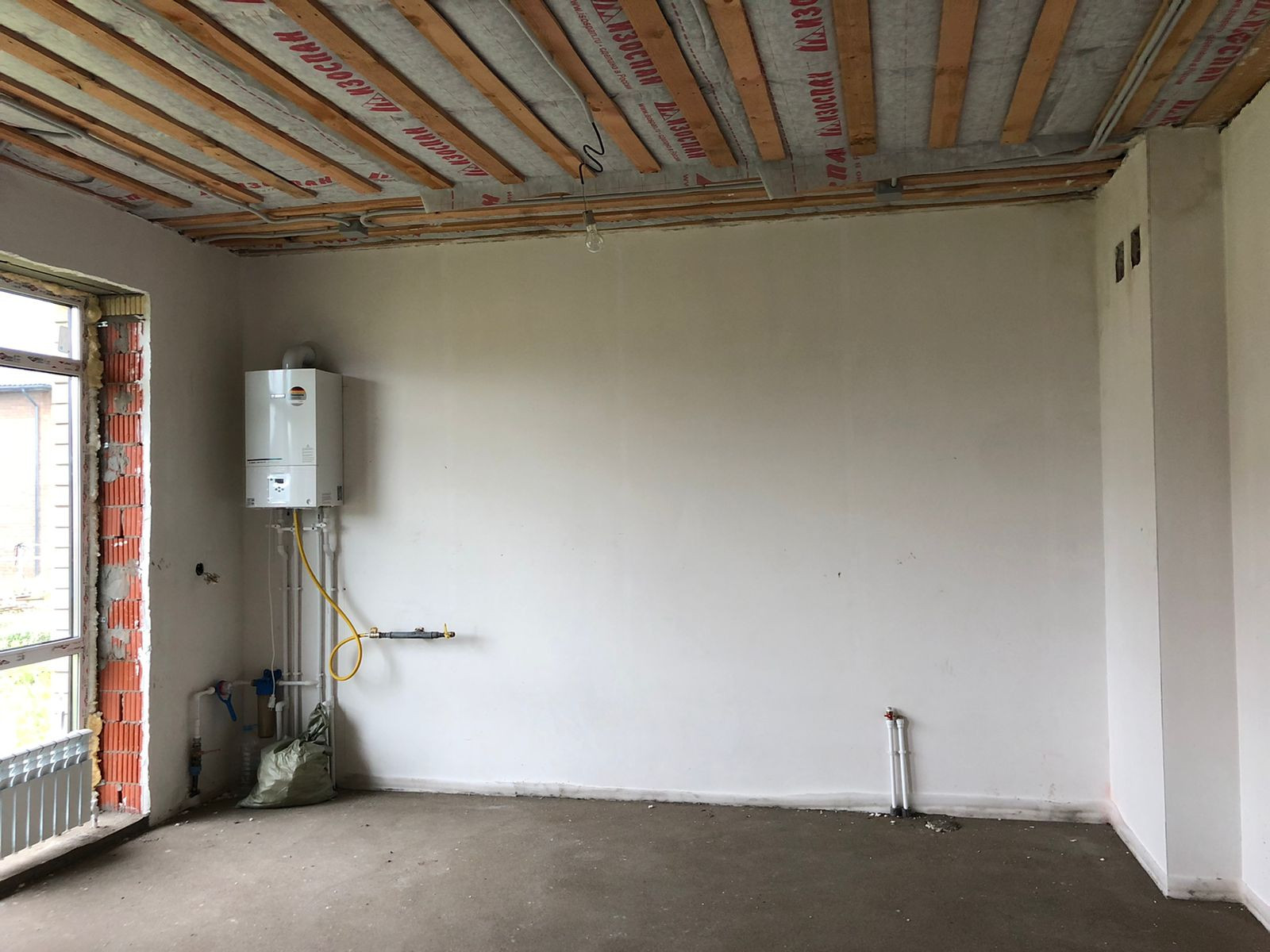 Установлен газовый двухконтурный котел( бош), установлены батареи.