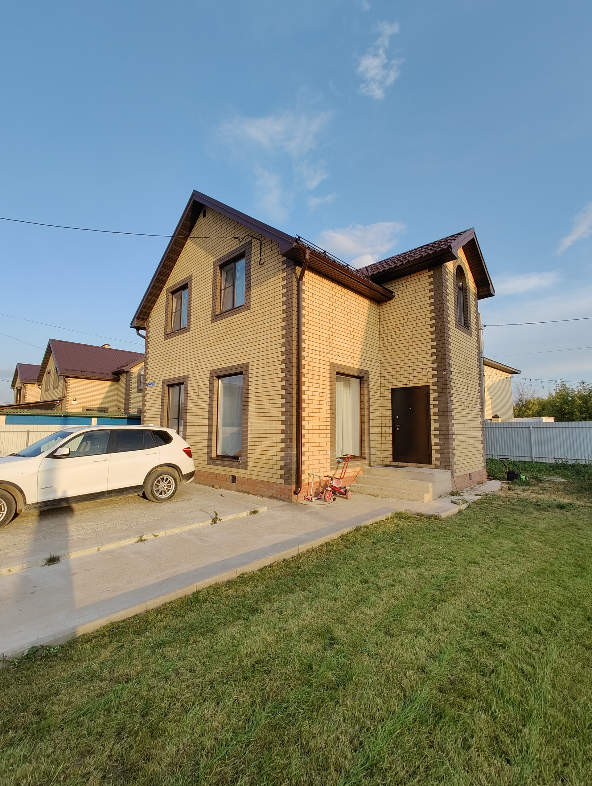 Дом находится в тупиковой улице, уложена асфальтовая крошка, можно спокойной гулять и кататься на велосипедах, чужие не ездят, в следующем году будет детская площадка. В 5 минутах ходьбы расположен хороший магазин с доступными ценами и всем необходимым, у въезда в поселок строят Пятерочку. В поселке есть школа, государственный и частный детский сад.