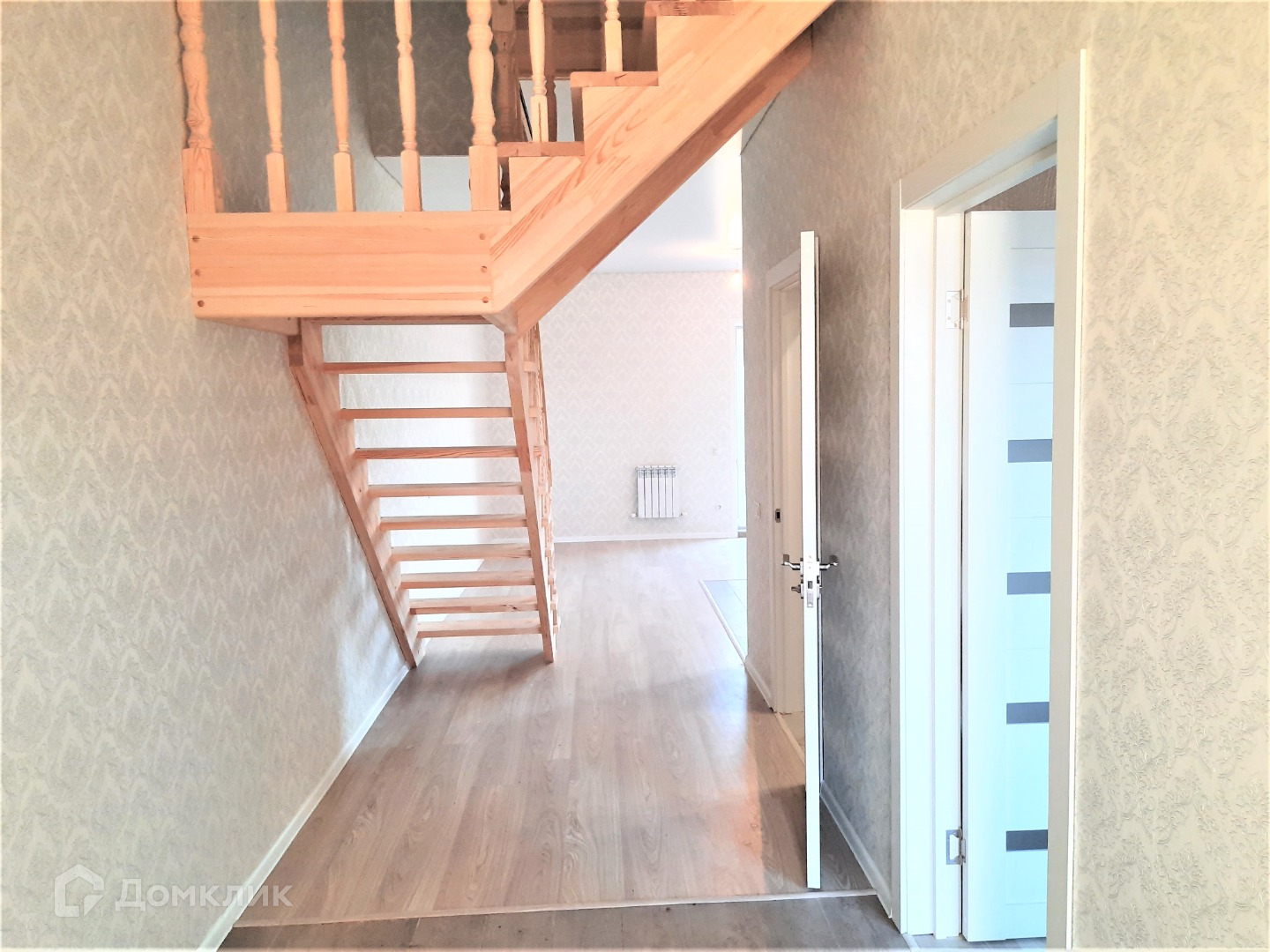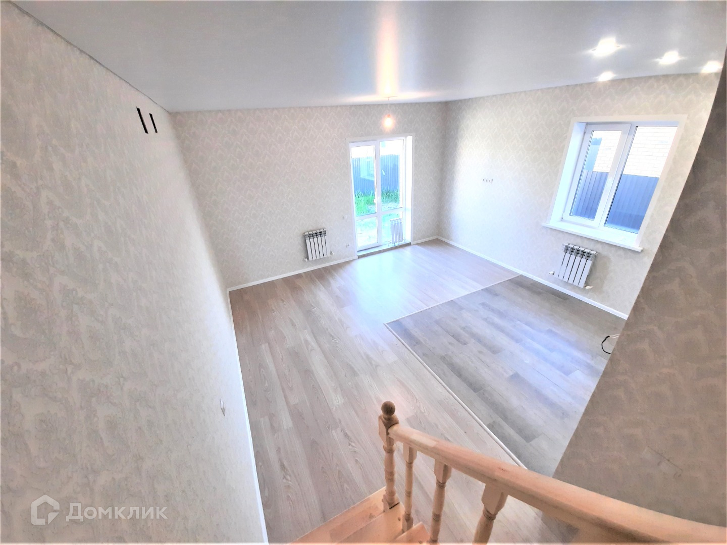 Хороший ремонт из качественных материалов. Полы - ламинат, мокрая зона в кафеле. Стены обои. Потолок натяжной с точечными светильниками - холл, в санузлах, кухонная зона. Откосы сделаны из сендвич панелей. Межкомнатные двери установлены. Санузлы в кафеле, 1 этаж сантехника установлена - душевая кабина, умывальник с тумбой, зеркало, унитаз. Лестница на 2-й этаж не скрипит, собрана на железном каркасе, окрашена (масло для лестниц) в белый цвет, ступени в темный.