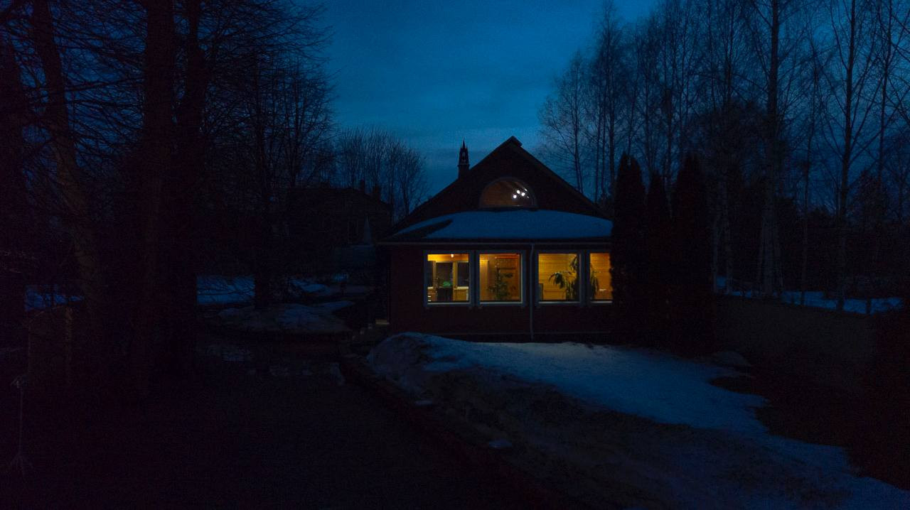 Поместье огорожено кирпичным забором с автоматическими воротами. По периметру освещение, камеры видеонаблюдения.