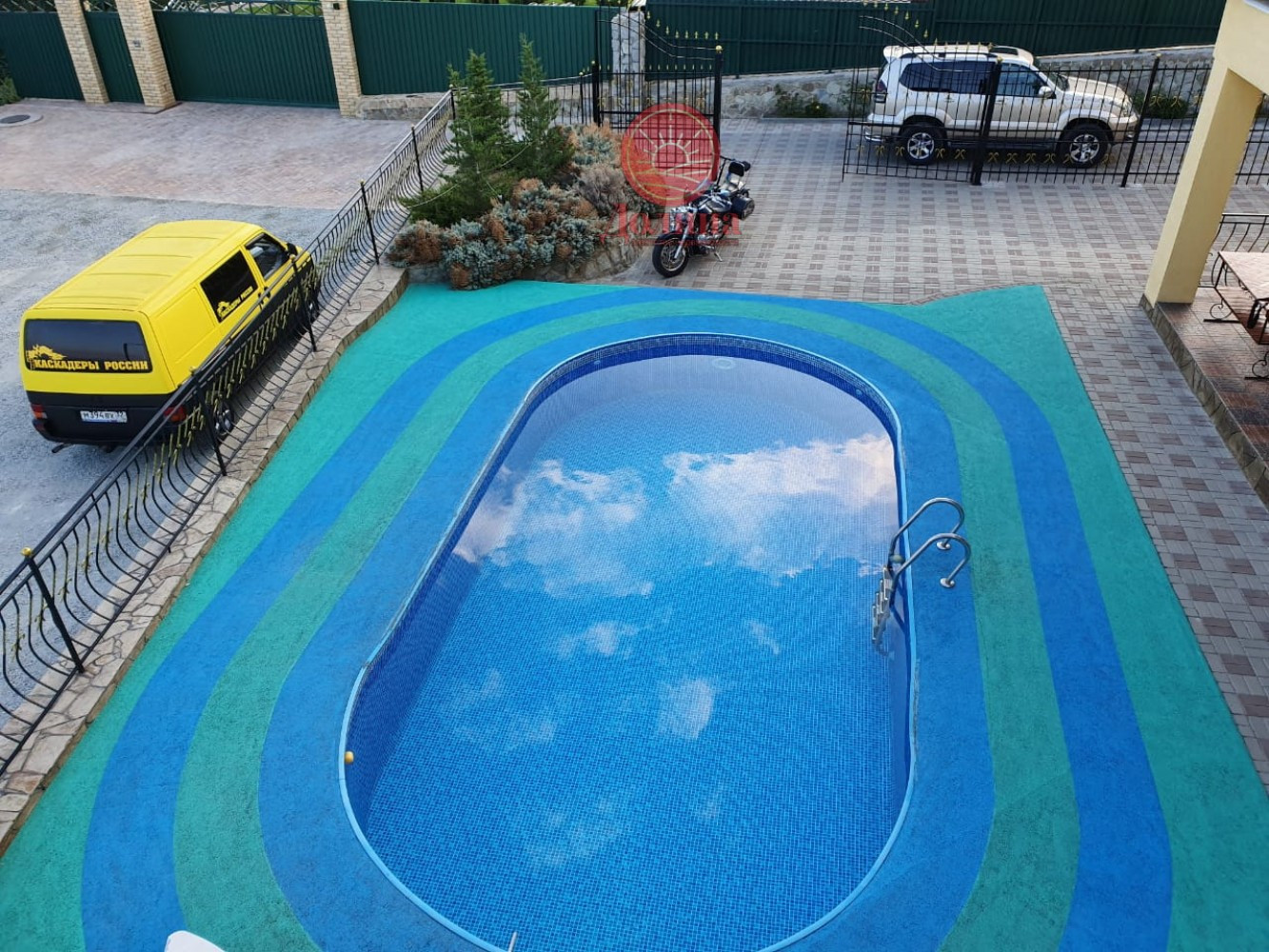 На ухоженном участке 5,5 соток  расположен  бассейн с современной системой очистки воды. Есть стоянка для  авто.