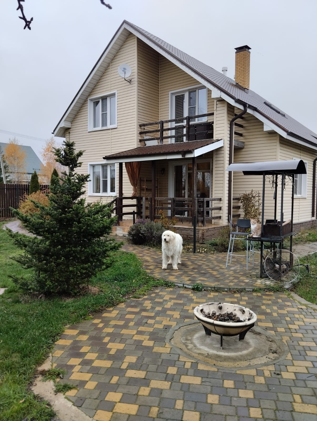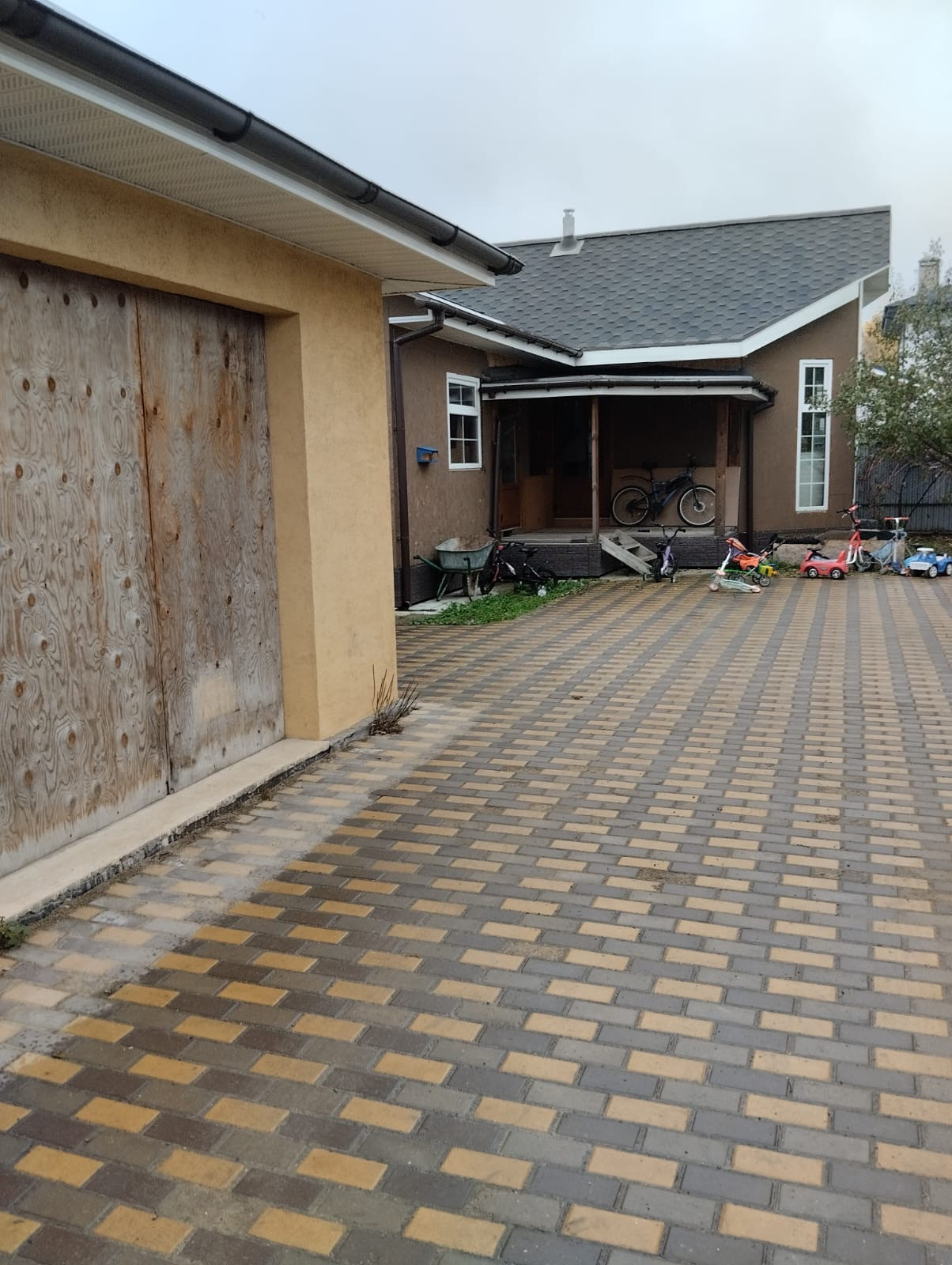 Вокруг дома, бани и гаража территория вымощена брусчаткой.