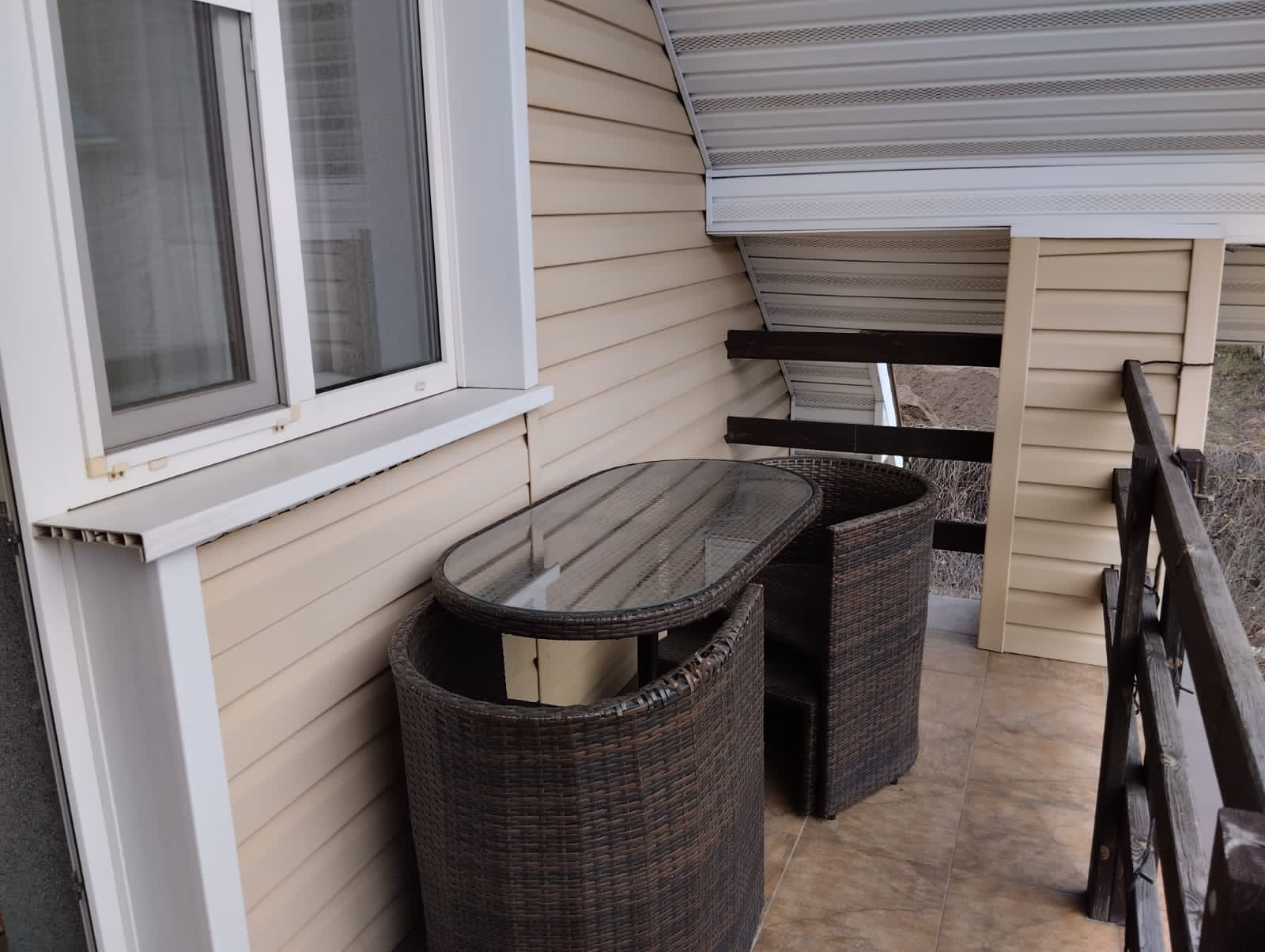 Построен из газосиликатных блоков толщиной 40 см, утеплён и обшит сайдингом.