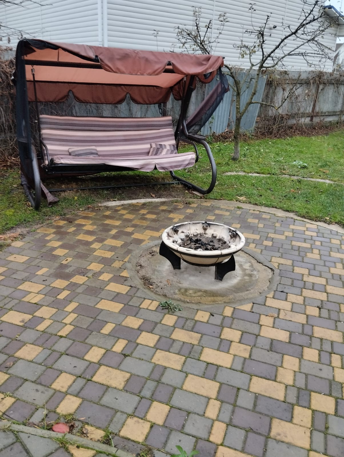 Организована зона отдыха с мангальной чашей и качелями.