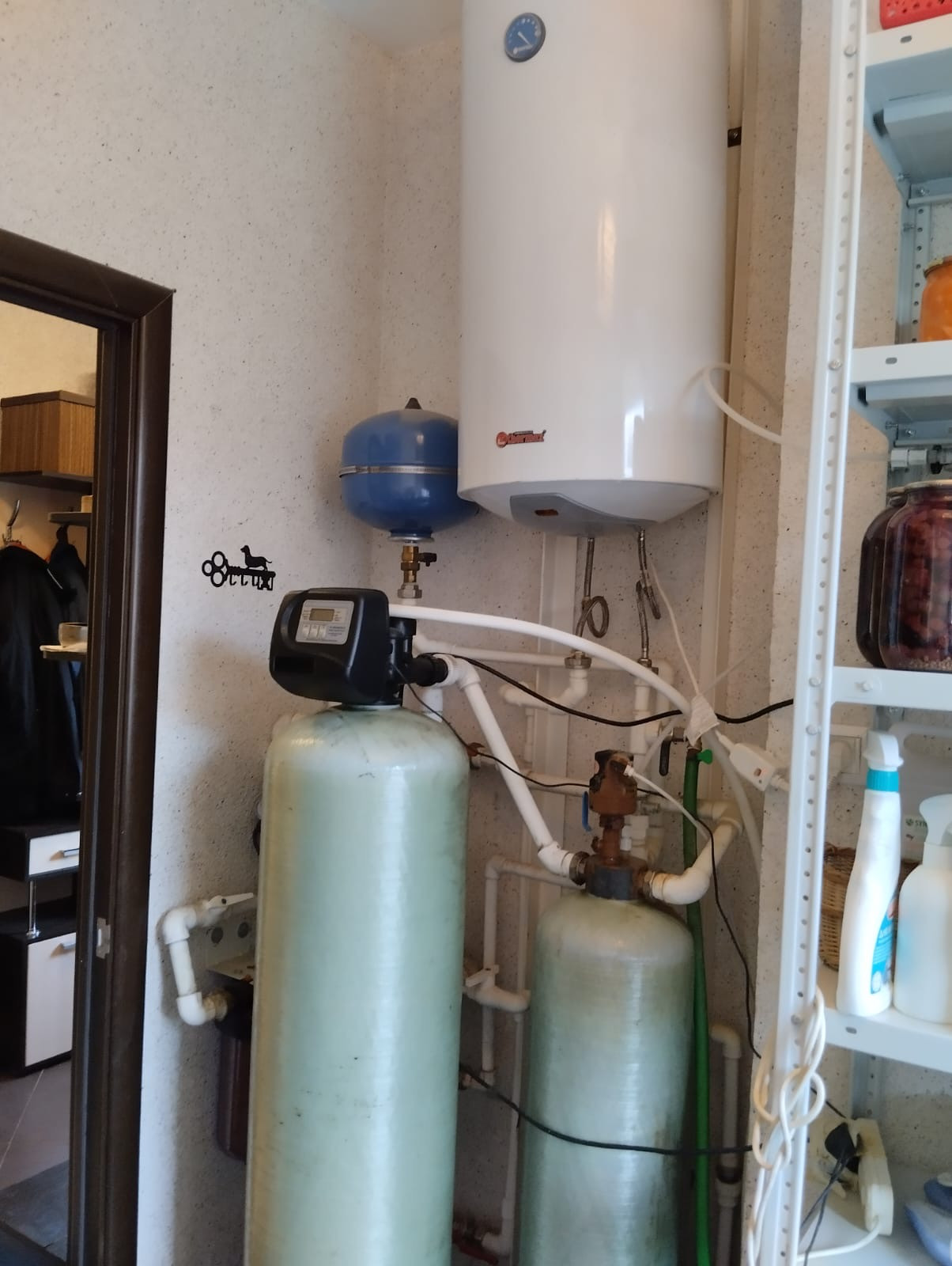 Вода-скважина, установлена система очистки воды от железа и система фильтрации питьевой воды методом обратного осмоса.