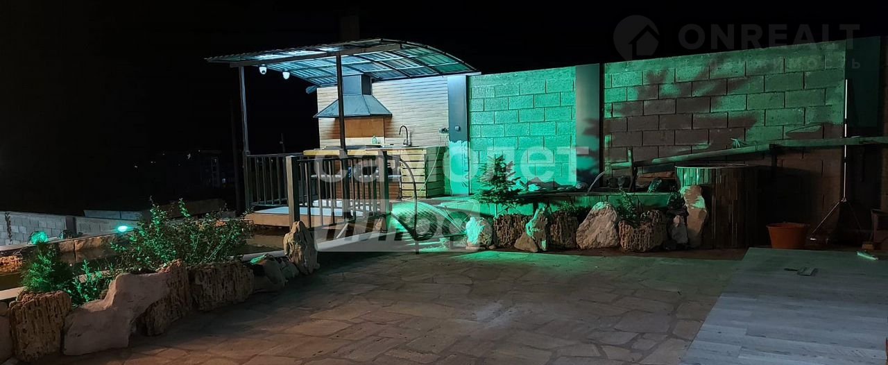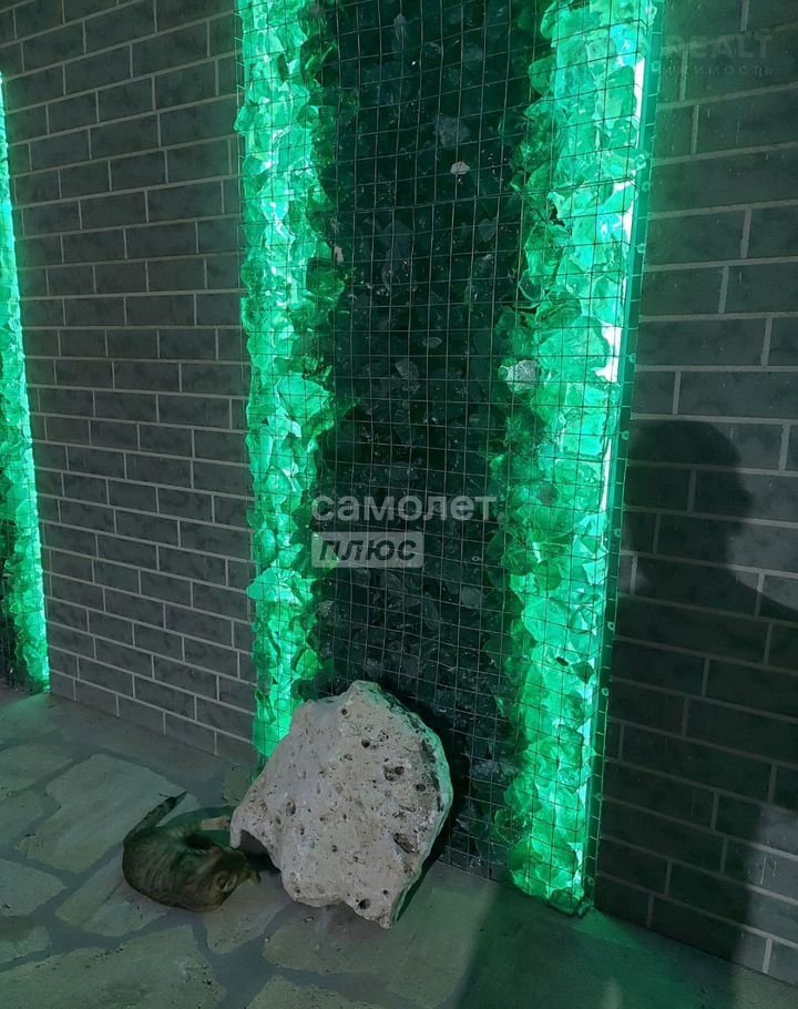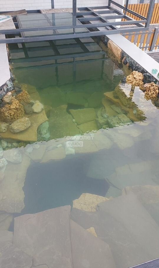 - Есть спортивная площадка, зона барбекю с беседкой и пруд с родниковой водой, видный через стеклянный пол беседки.