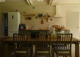 Дом деревянный, 2014 года постройки. Фундамент бетонные сваи, стены сруб + брус. Металлочерепица. 1-м этаж прихожая, гостиная 22 кв м, спальня, санузел, кухня-столовая 21 кв м и бойлерная с кладовой. 2-м этаж 2 детские комнаты, 1 большая спальня, холл и санузел. В доме вода, электричество 10 кВт, газ в 50 метрах от дома. Отопление: комбинированны... |