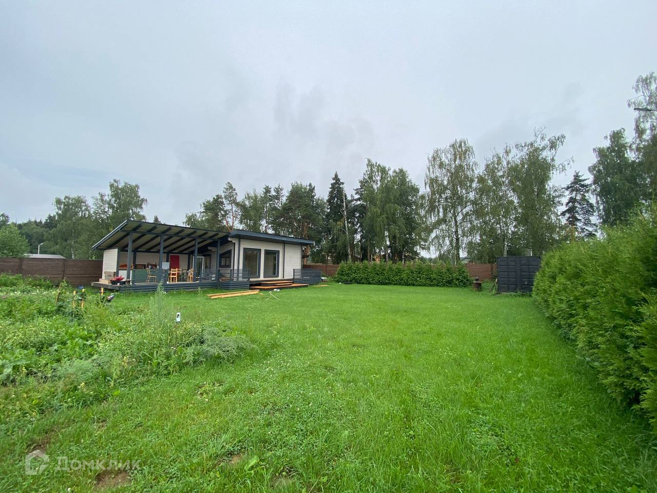 Участок ровный, выполнен ландшафтный дизайн (газон, по периметру высажены туи), по всему периметру участок огорожен забором из дерева, так же установлены автоматические откатные ворота с автоматикой Nice.