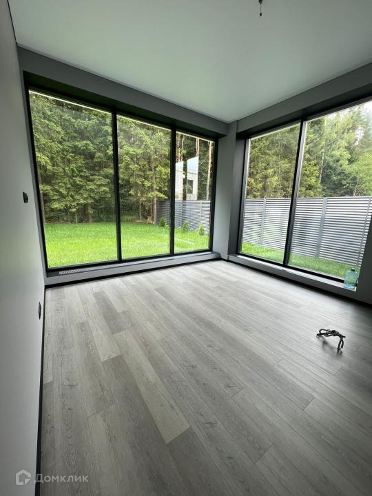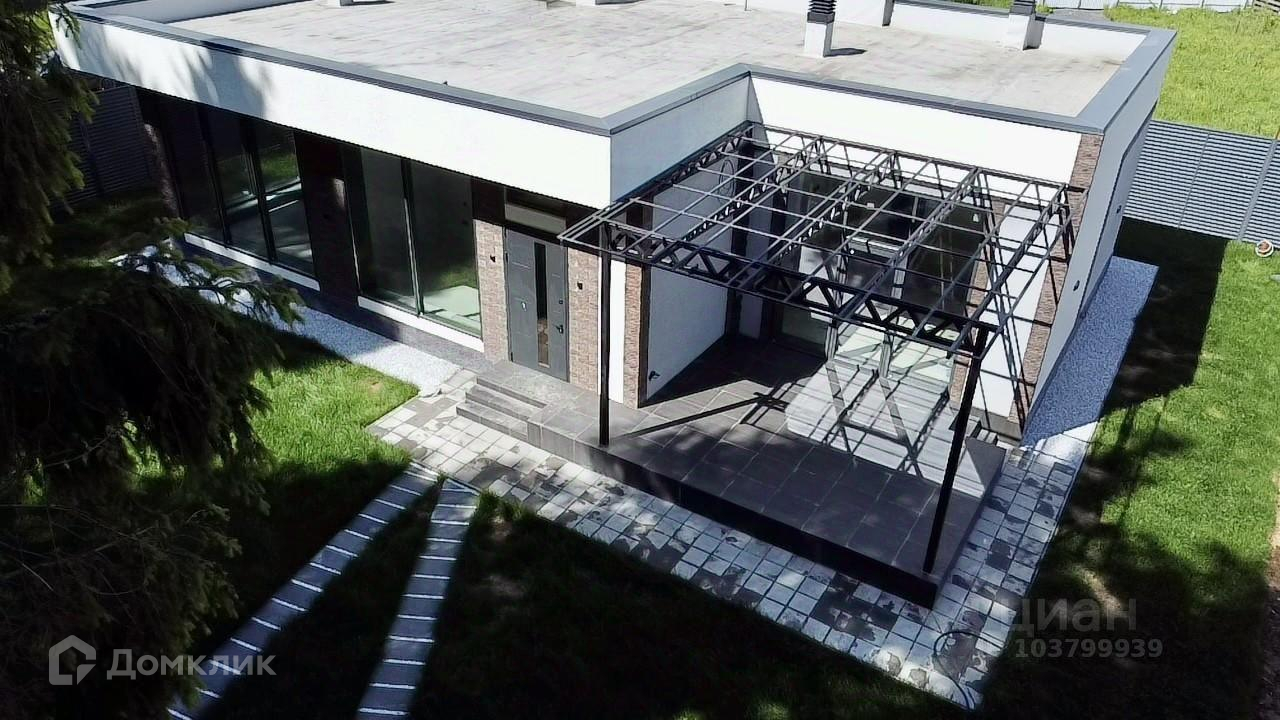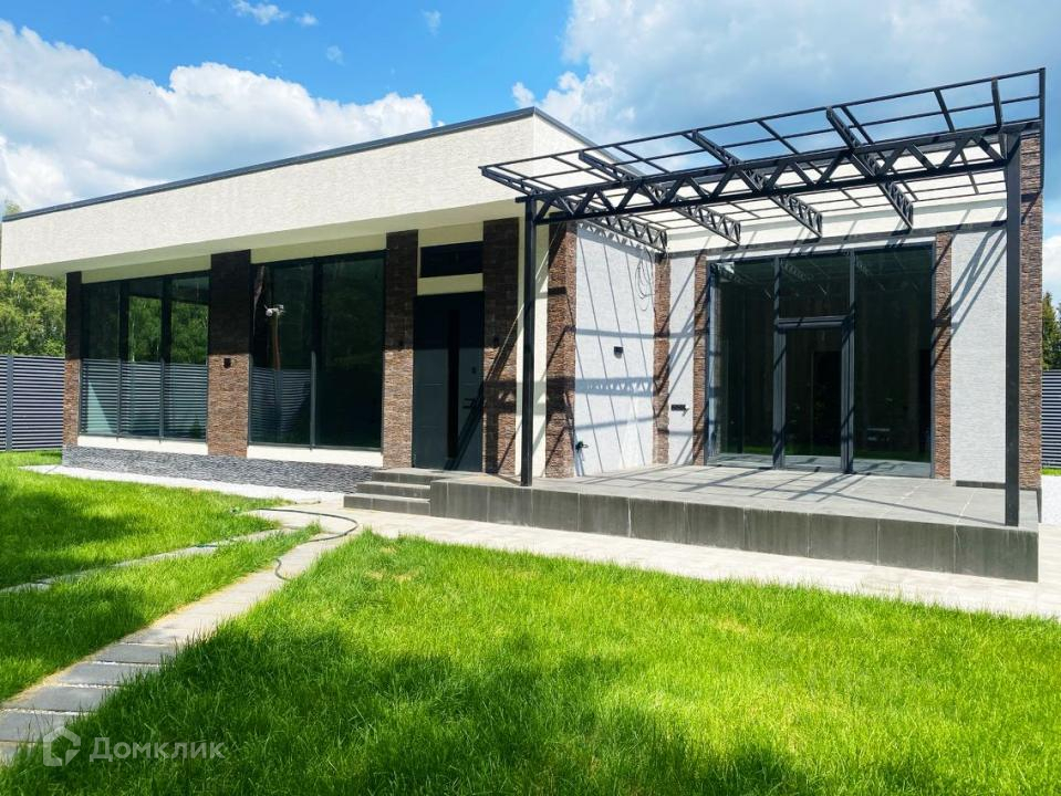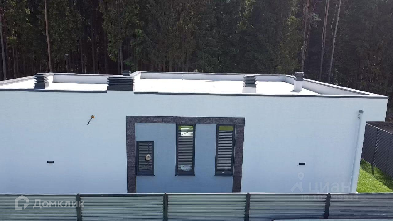 Дом в стиле Хай-тек, плоская крыша (ПВХ мембрана, кровельный пирог с техническими характеристиками под эксплуатацию), большие панорамные окна (алюминиевый профиль), высокие потолки, большие просторные комнаты, два санузла.