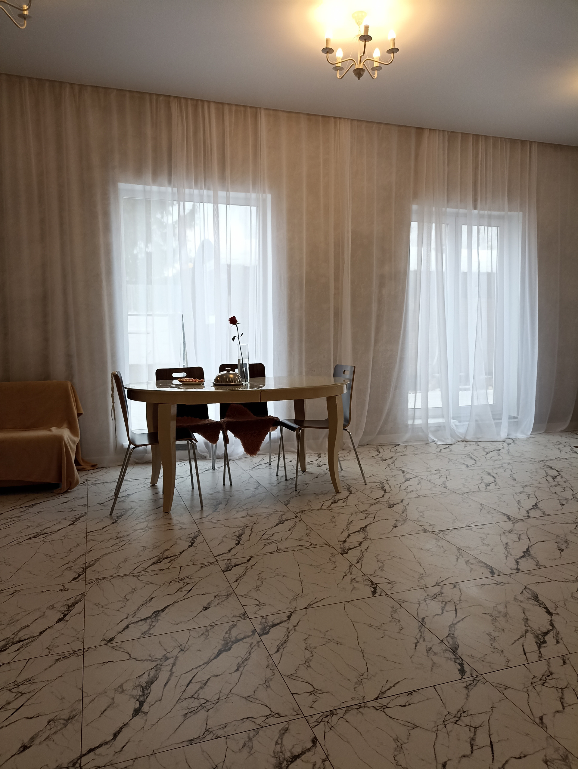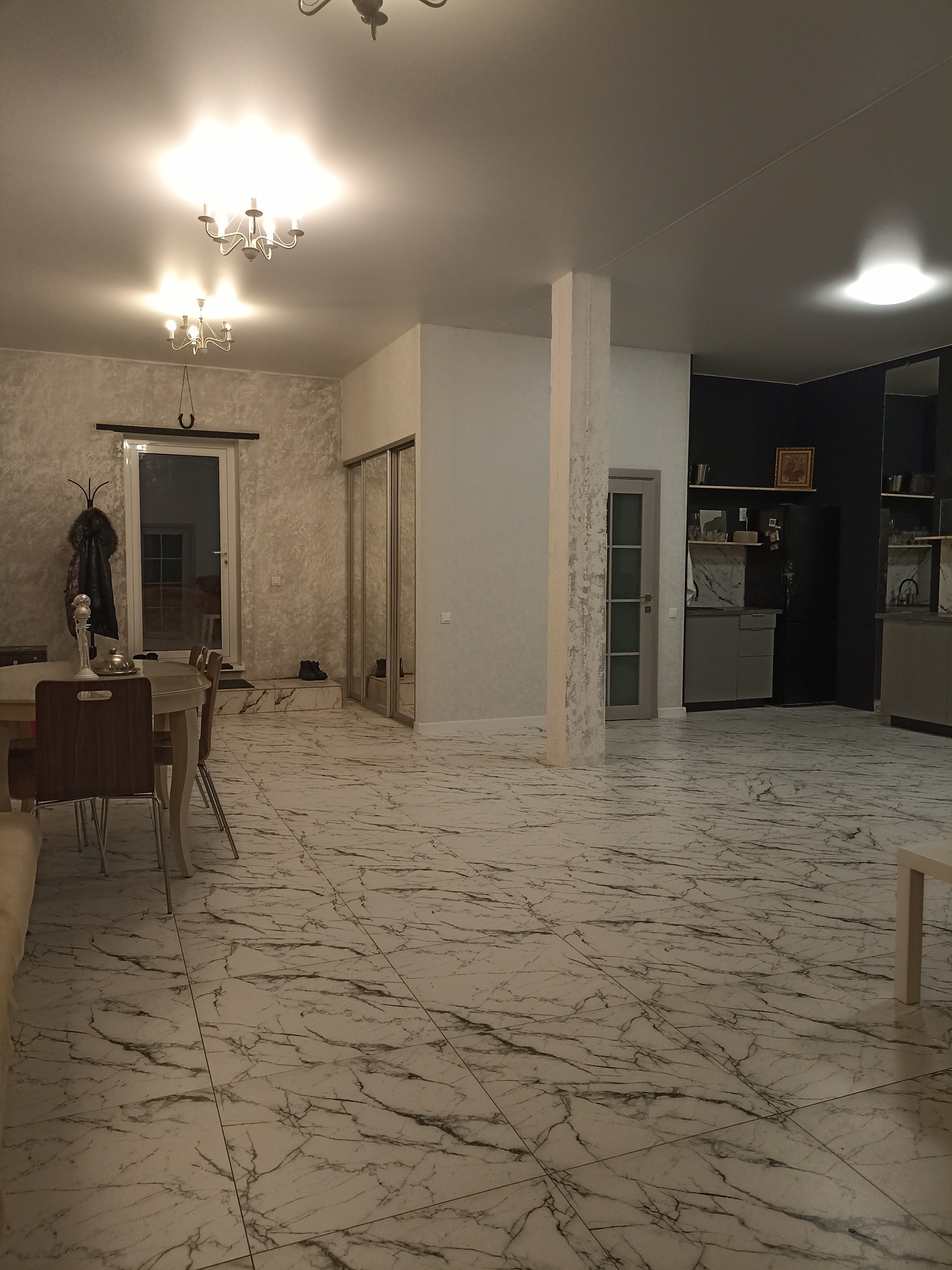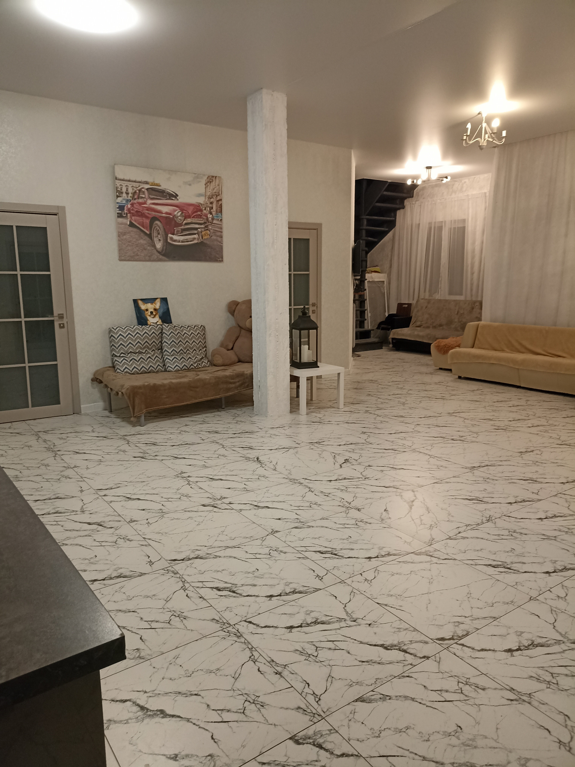 Дом 300м, три этажа. На первом - просторная гостиная 70м, с кухней, с окнами в пол, две спальни, санузел с ванной и бойлерная.