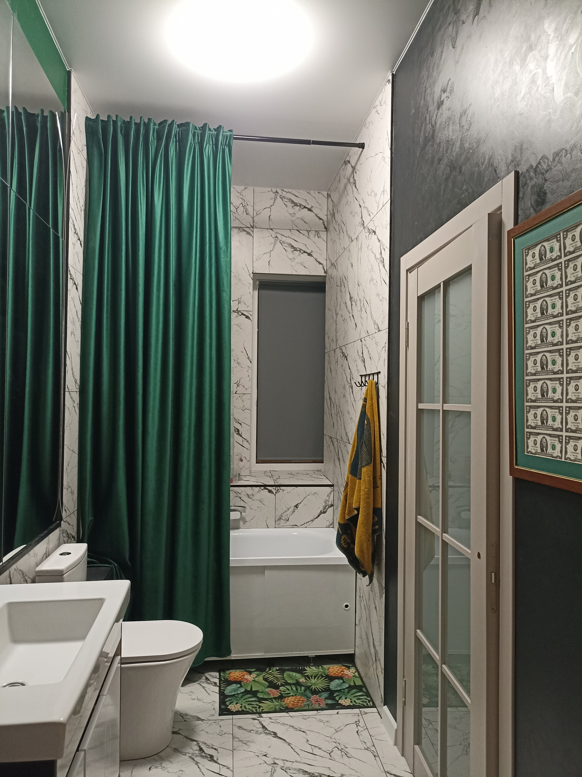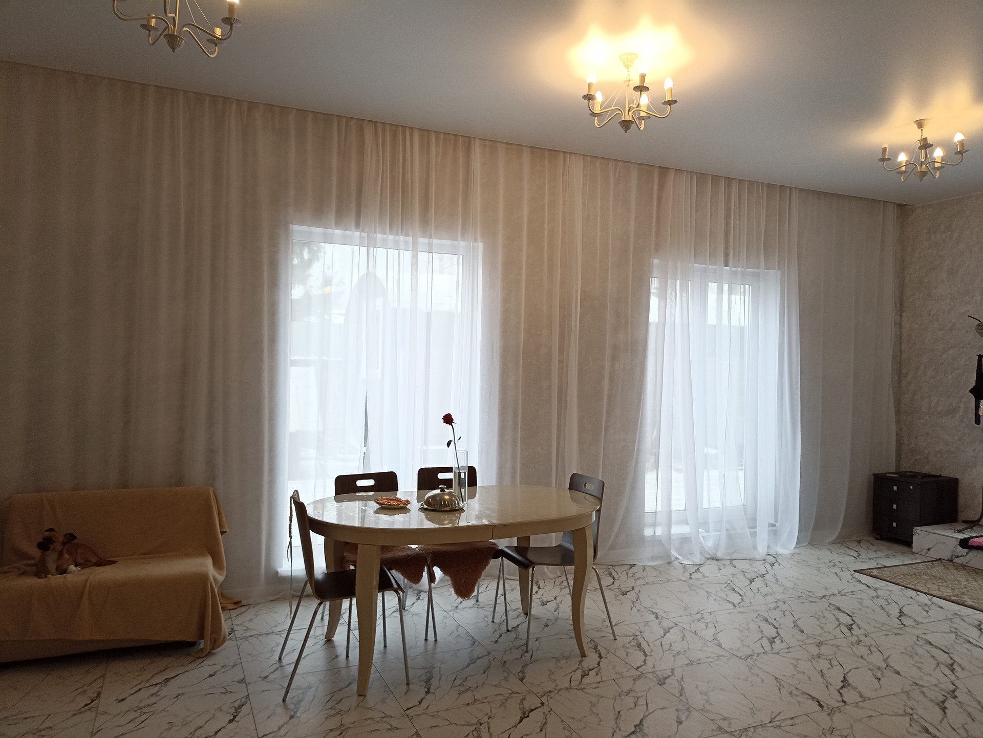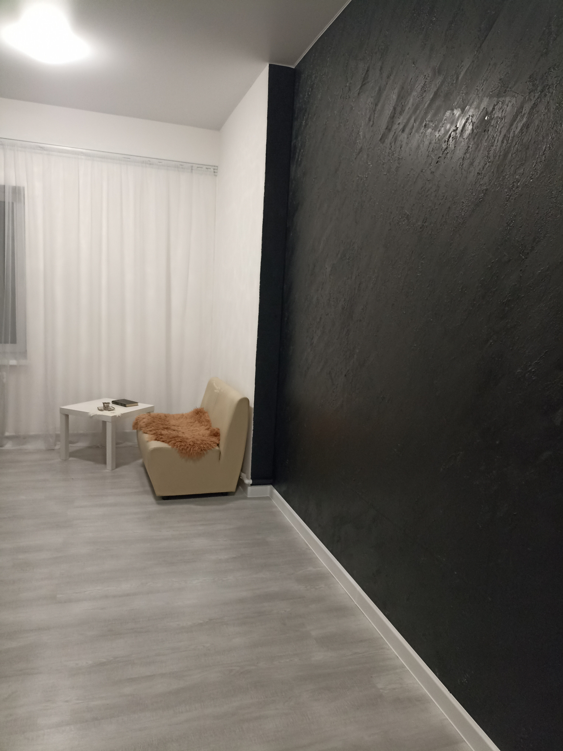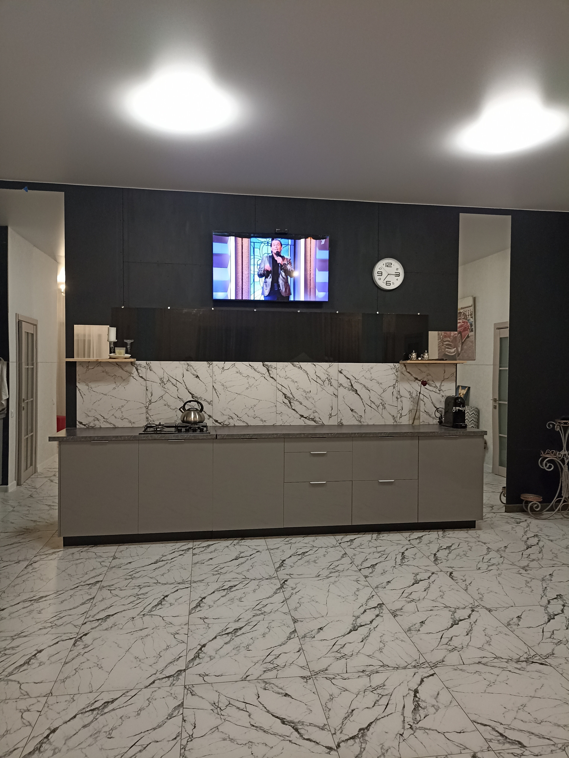 Дом 300м, три этажа. На первом - просторная гостиная 70м, с кухней, с окнами в пол, две спальни, санузел с ванной и бойлерная.