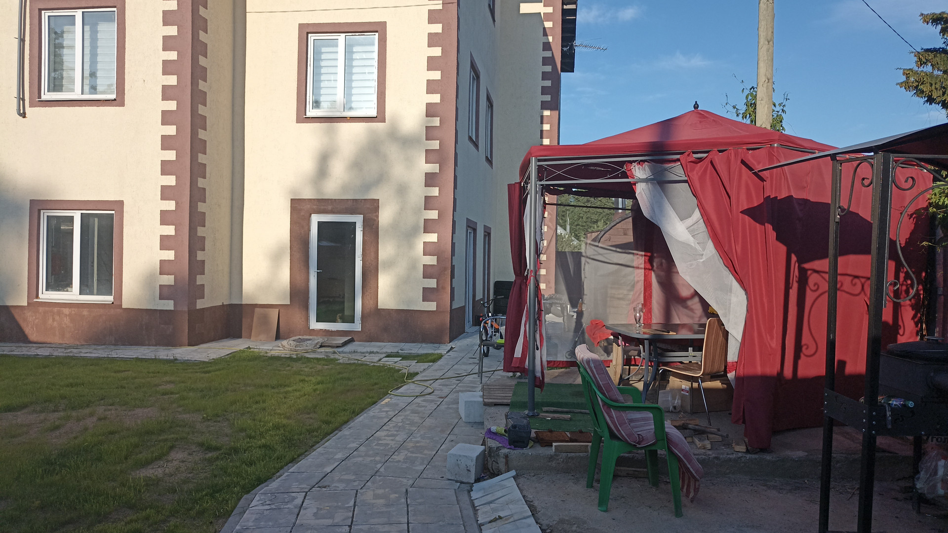 На участке баня - бочка с комнатой отдыха, мангал и беседка. В общем, созданы все условия для жизни и отдыха семьи и большой компании. Дом имеет статус большой квартиры, потому как разделён по документам на 2 хозяина, вторая квартира 150м, тоже продаётся. Можно приобрести обе части, общей площадью в 450 м.