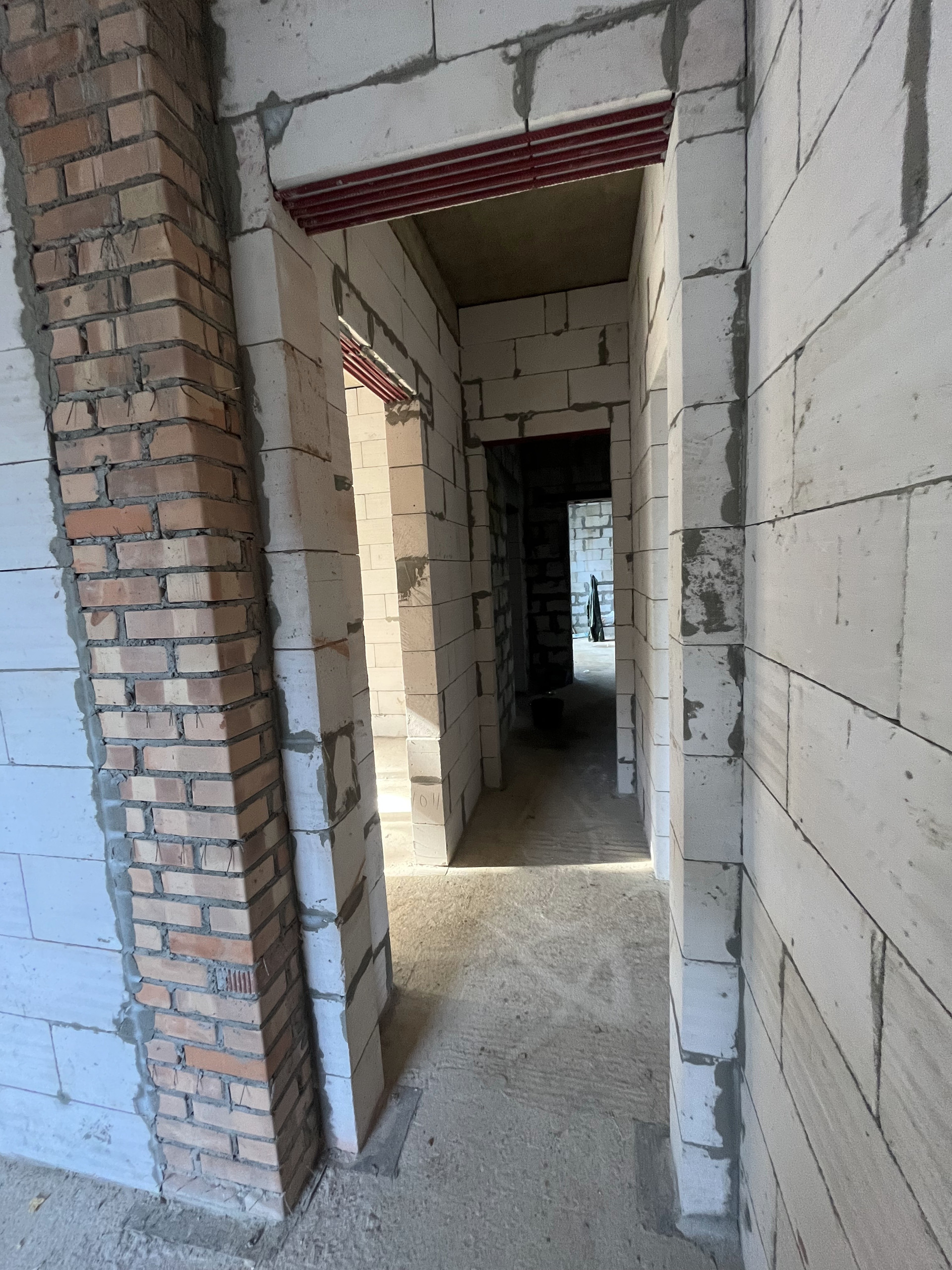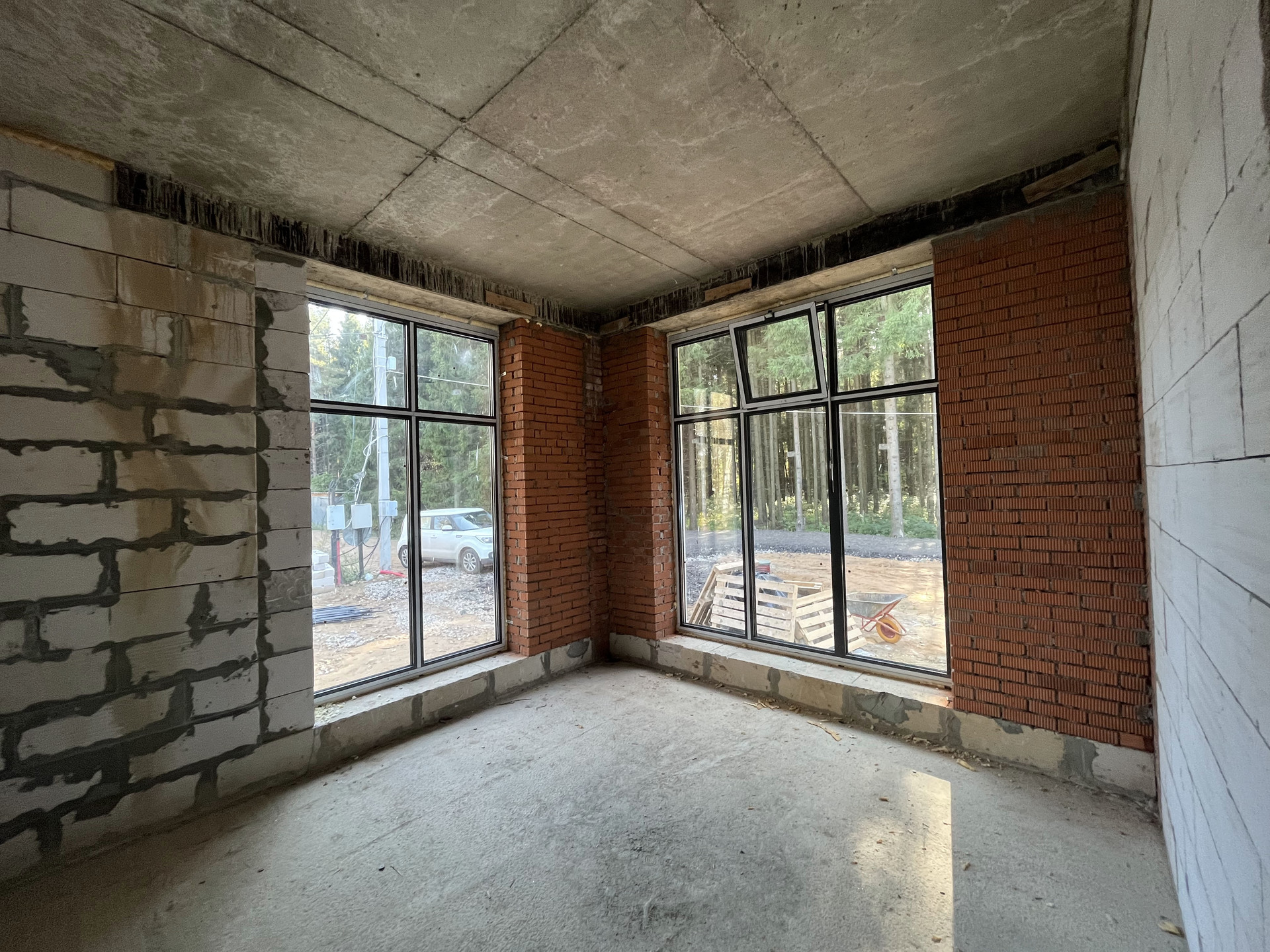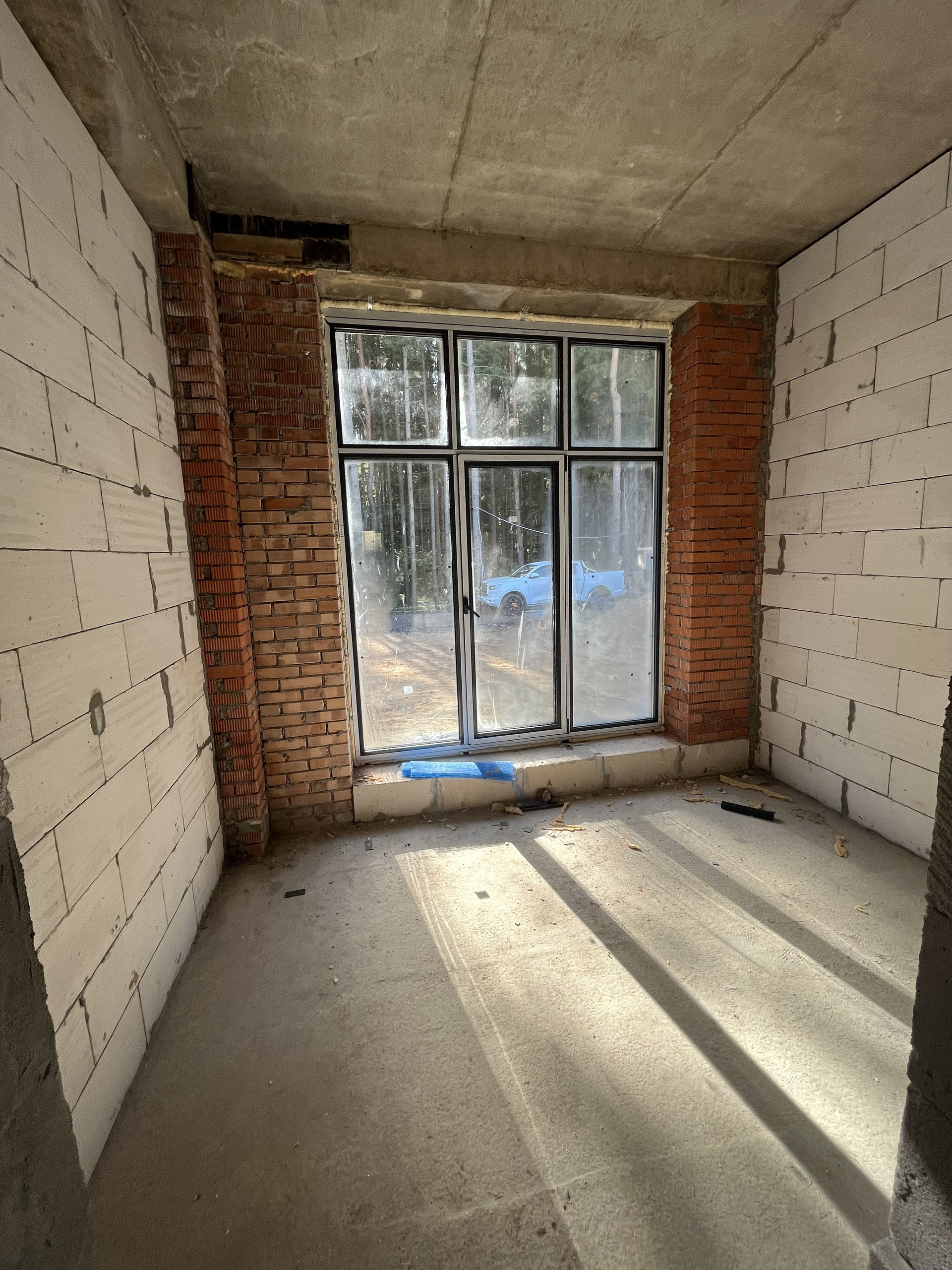 Индивидуальный проект, дом с собственным выходом в лес,свайно-ростверковый фундамент, монолитная плита 200мм пола, кирпичные колонны (кирпич м-300) периметр газосиликатные блоки D500, спросите зачем для одноэтажного дома такой конструктив, отвечу: планировали для себя и на века! Денег не жалели, высота потолков 3500мм